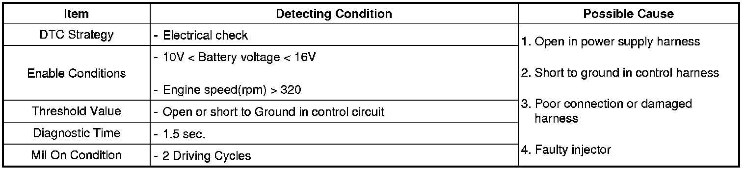 Based on information from various sensors, the PCM measures the fuel injection amount. The fuel injector is a solenoid-operated valve and the fuel injection amount is controlled by length of time the fuel injector is held open. The PCM controls each injector by grounding the control circuit. When the PCM energizes the injector by grounding the control circuit, the circuit voltage should be low (theoretically 0 V) and the fuel is injected. When the PCM de-energizes the injector by opening the control circuit, the fuel injector is closed and circuit voltage should momentarily peak.