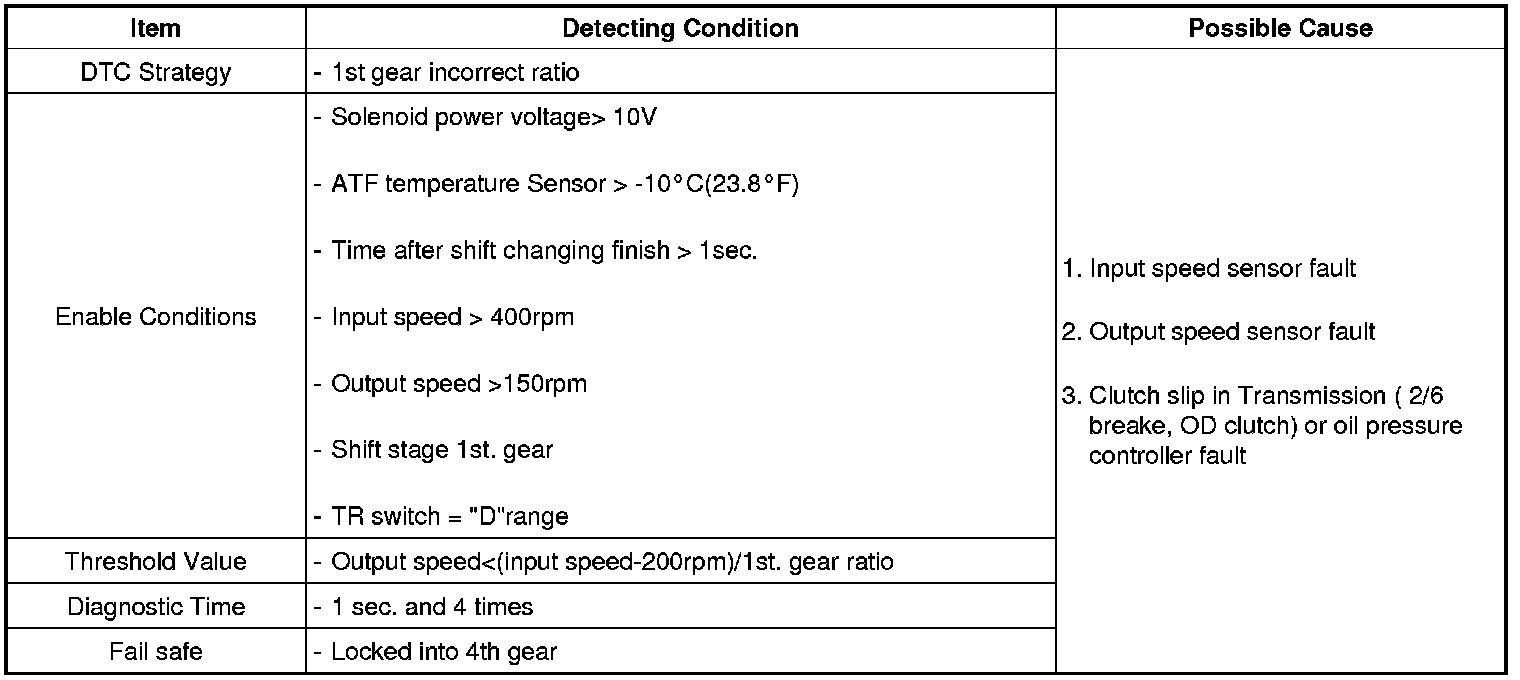 This DTC is set when Input speed sensor value is different with TCM operation value, caused by control valve sticking, solenoid valve fault (most of fault is mechanical, rarely electrical fault).