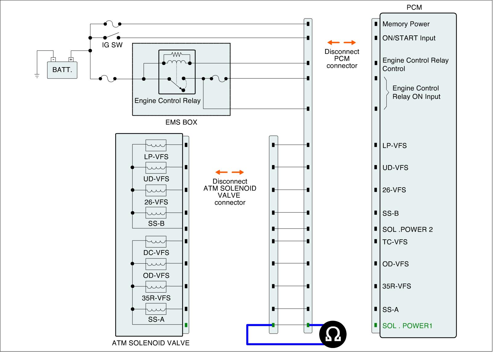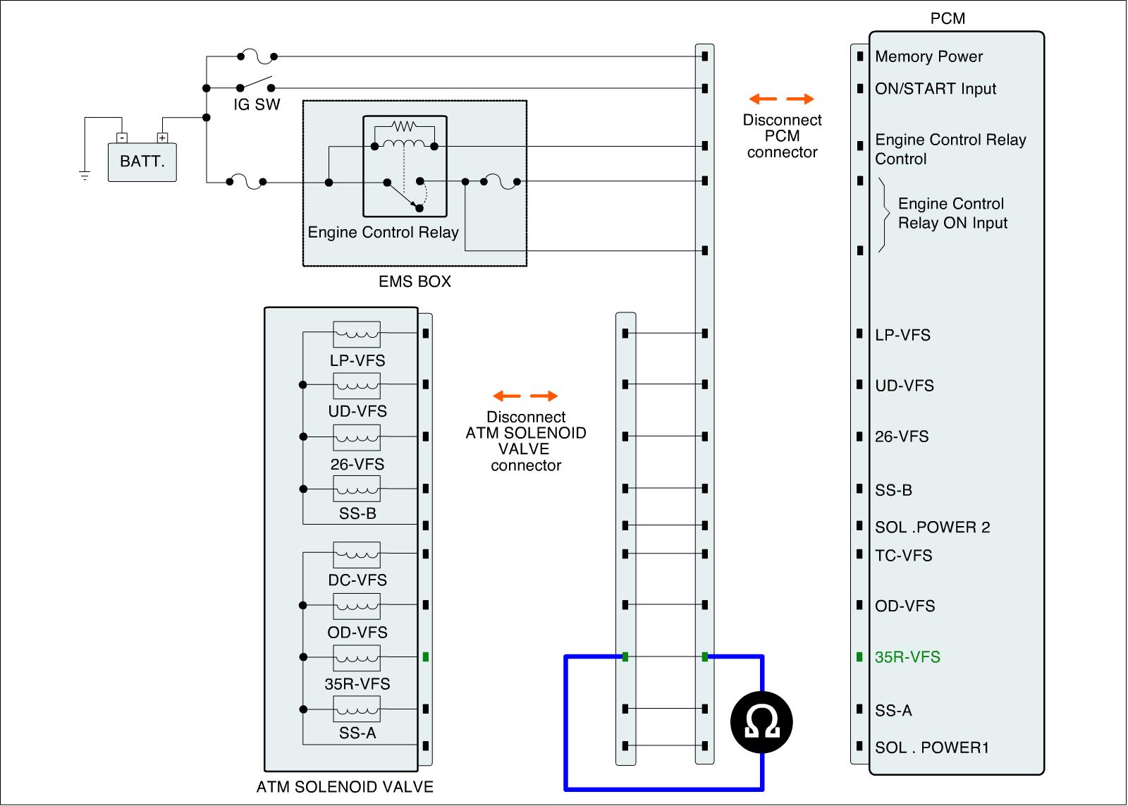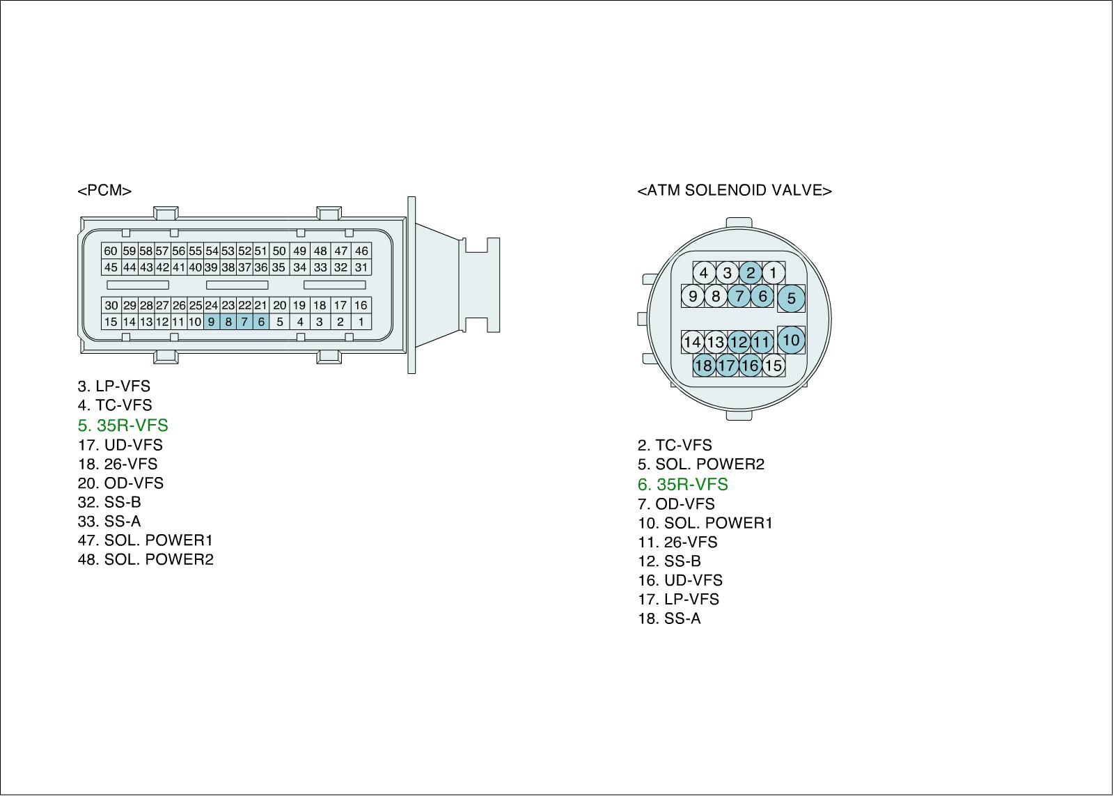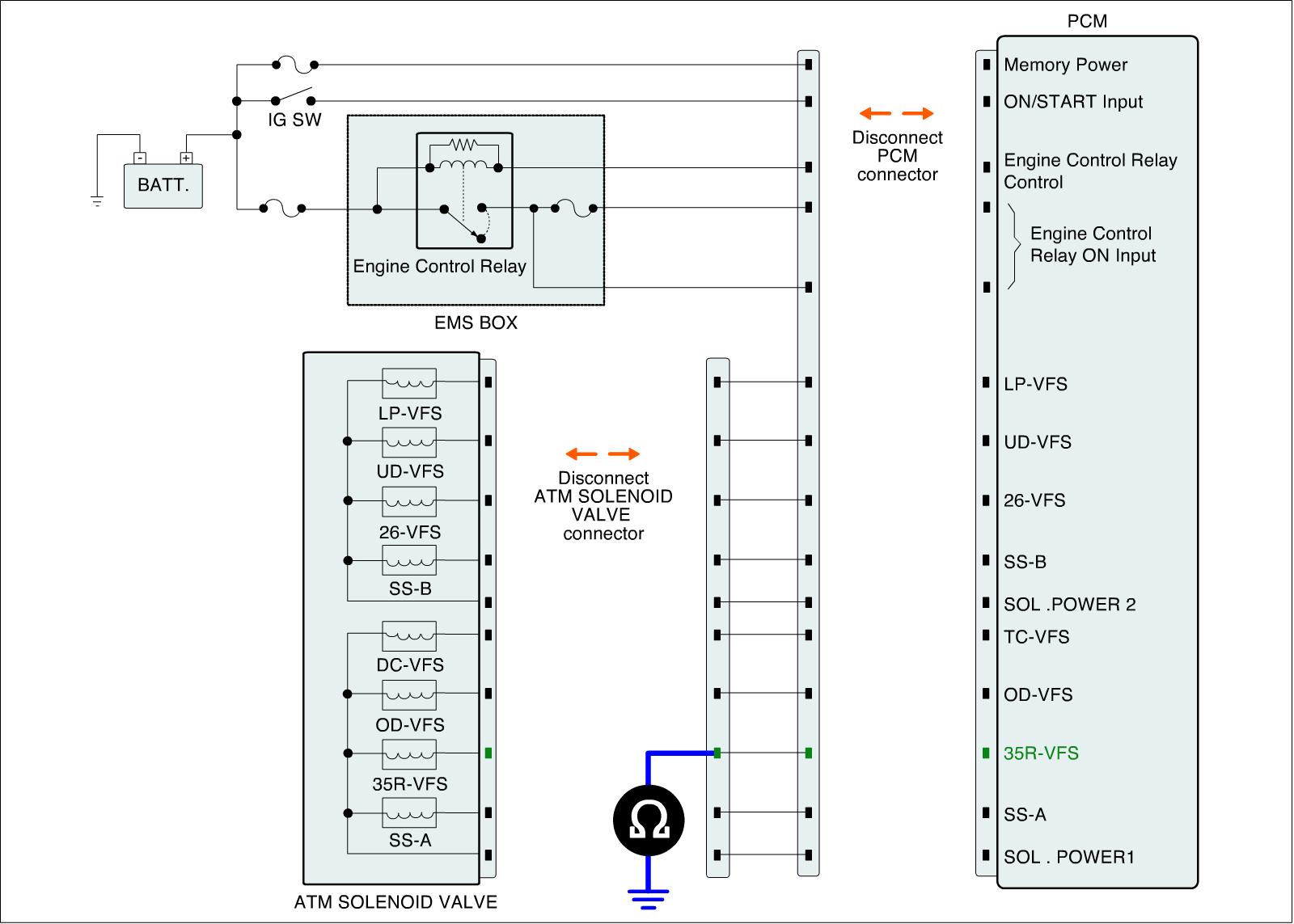 3. Measure resistance between power of "35R/C-VFS" connector of ATM solenoid valve and power of "35R/C-VFS" connector of PCM/TCM.