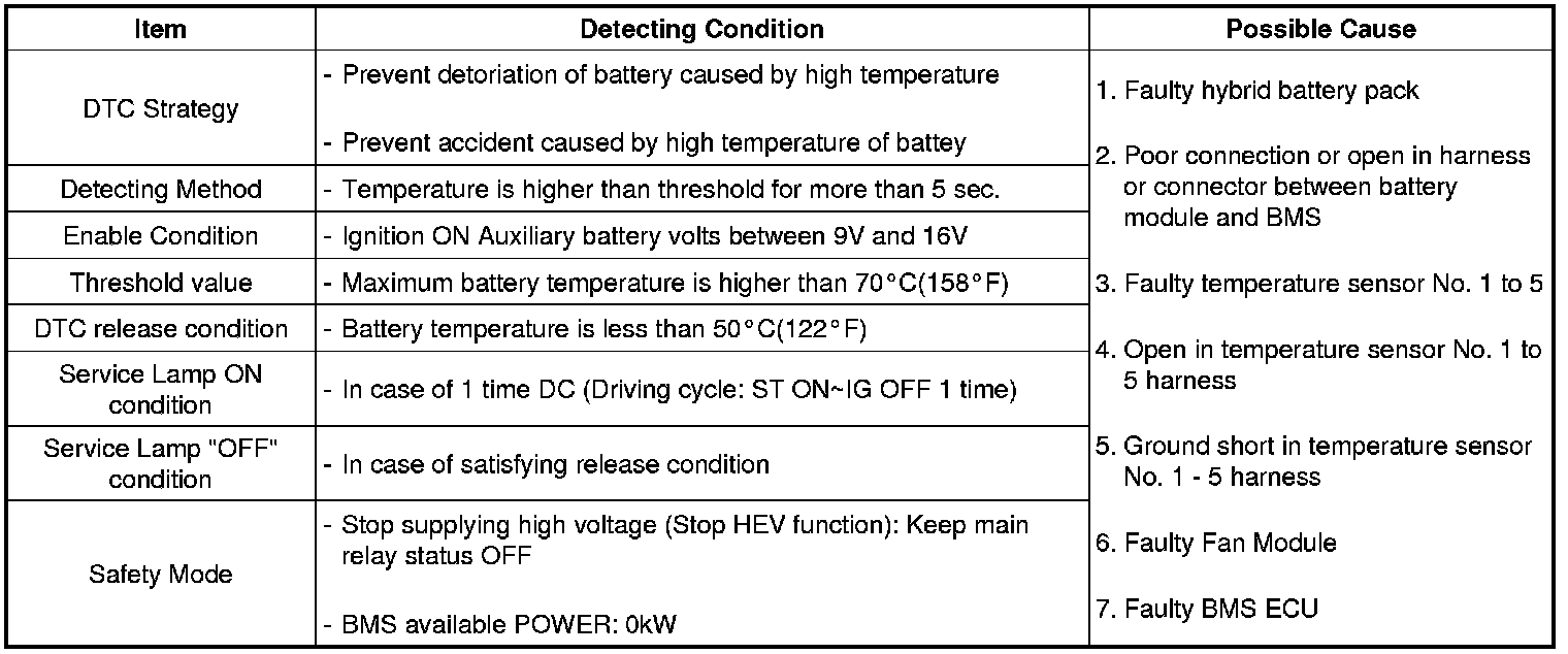 The BMS ECU receives readings from 5 temperature sensors installed in the High Voltage Battery. The BMS ECU sets P0A7E when maximum battery temperature goes above 70 °C (158 °F).