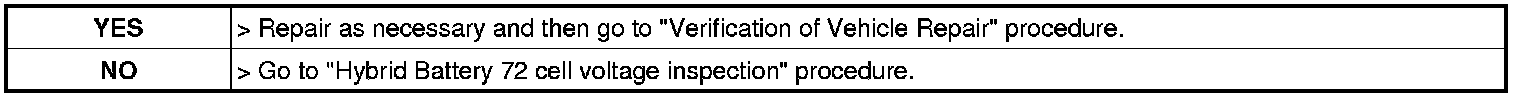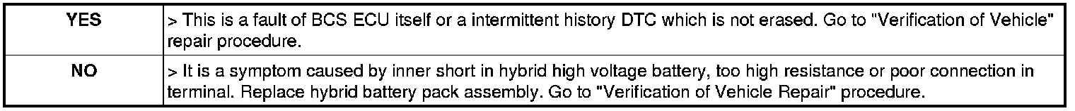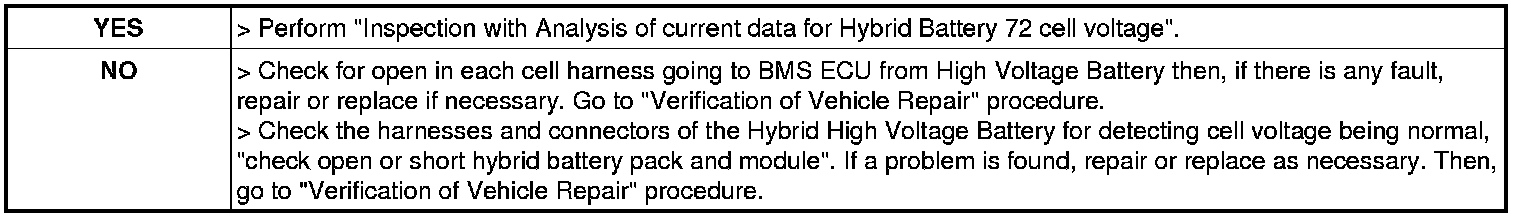 - If measured cell voltage is lower than 4.8 V, it is the BMS ECM itself or a history DTC. Go to "Verification of Vehicle Repair" procedure.