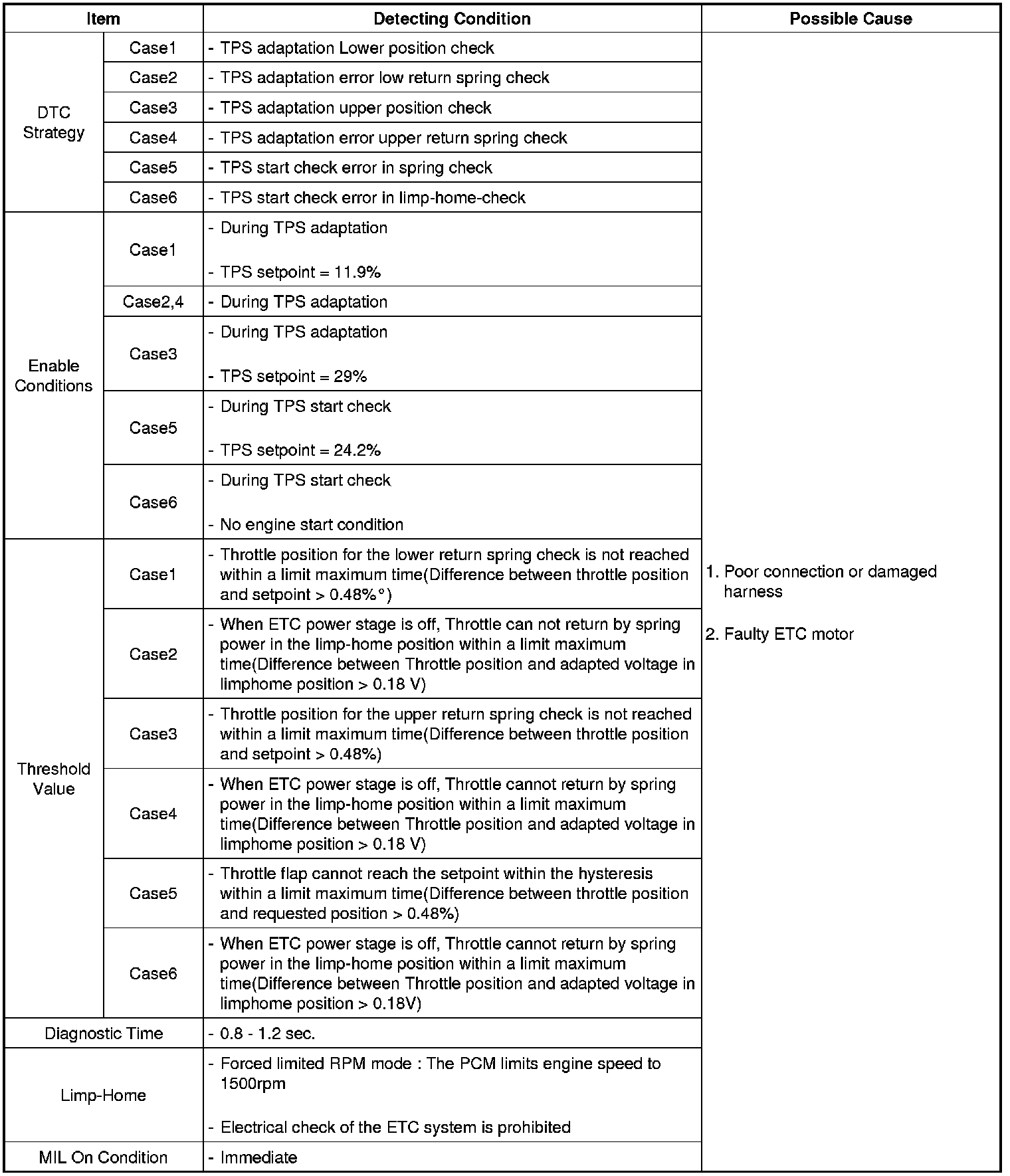 The Electronic Throttle Control (ETC) system is made of the components throttle body, Throttle Position Sensor (TPS)1&2 and Accelerator Position Sensor (APS) 1&2. The throttle body contains the actuator, the throttle plate and the throttle position sensor (potentiometer), which are integrated in one housing. The actuator consists of a DC motor with a two-stage gear. The opening angle of the throttle valve is detected by the throttle position sensor which is mounted on the throttle body. And it provides feedback to the PCM to control the throttle motor in order to control the throttle valve opening angle properly in response to the driving condition.