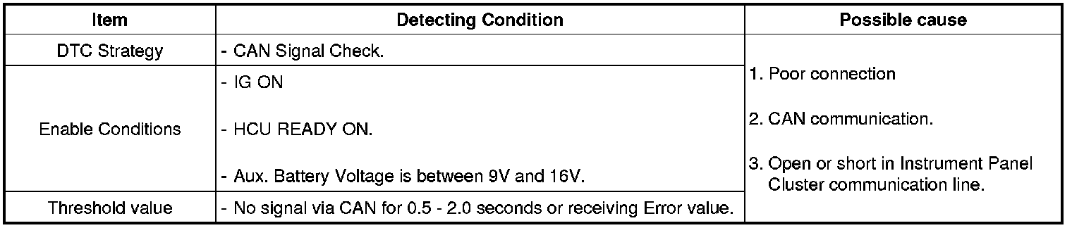 The HCU sets DTC U0155 if No message during 0.5 - 2.0s has not been received through the CAN signal.