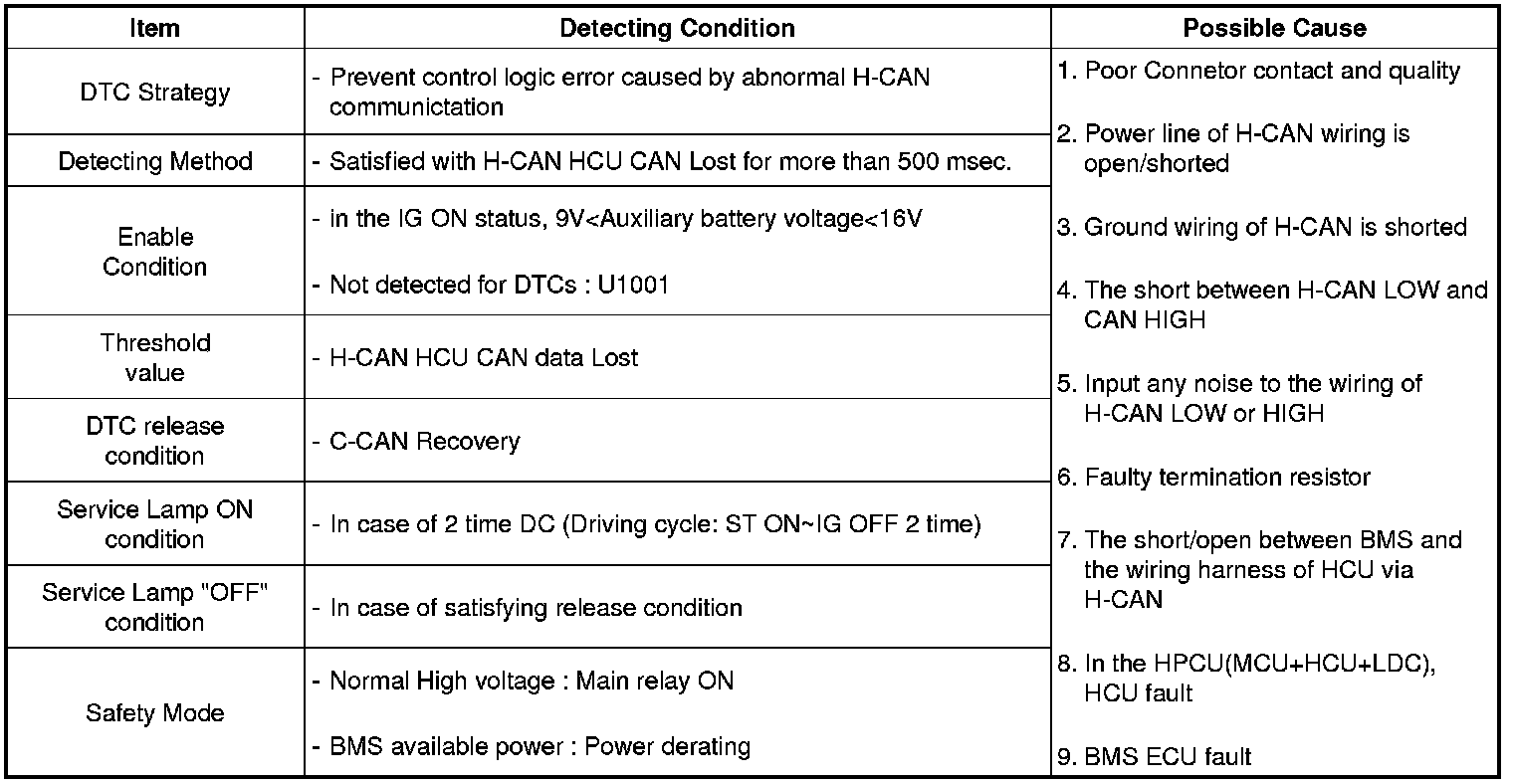 BMS ECU sets DTC U1004 when BMS ECU could not communicate with a HCU via H-CAN.Although it occurs, the service lamp is not turned on. If it is recovery to a normal state, the current DTC will delete after lasting 2 terms driving cycle (IG ON /OFF), and then generate a historic DTC (H character is displayed at the end of the DTC code).