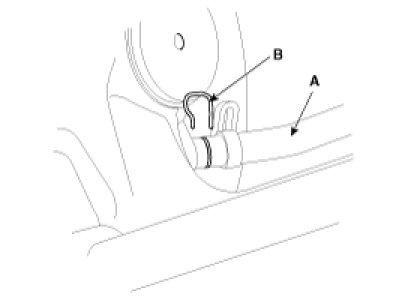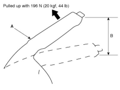 1. Pull the parking brake lever (A) with 196 N (20 kg, 44lbf) force to fully apply the parking brake. The parking brake lever should be locked within the specified number of clicks (B).