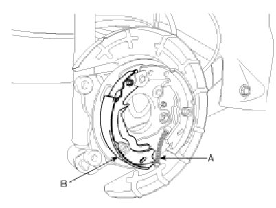 12. Remove the parking brake cable (A) from the parking brake shoe (B).