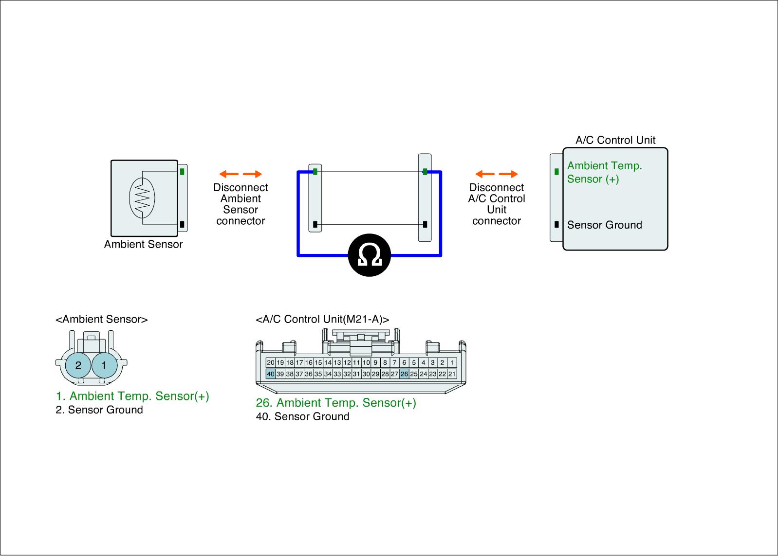 3. Measure resistance between Signal(+) terminal of ambient sensor harness connector and Signal(+) terminal of A/C-ECU harness connector.