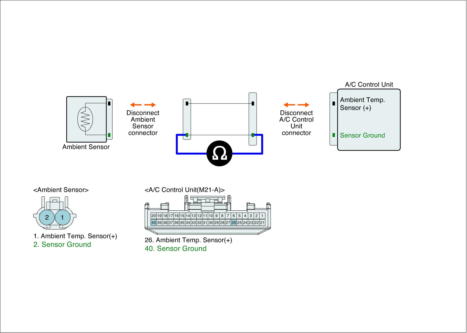 3. Measure resistance between ground terminal of ambient sensor harness connector and ground terminal of A/C-ECU harness connector.