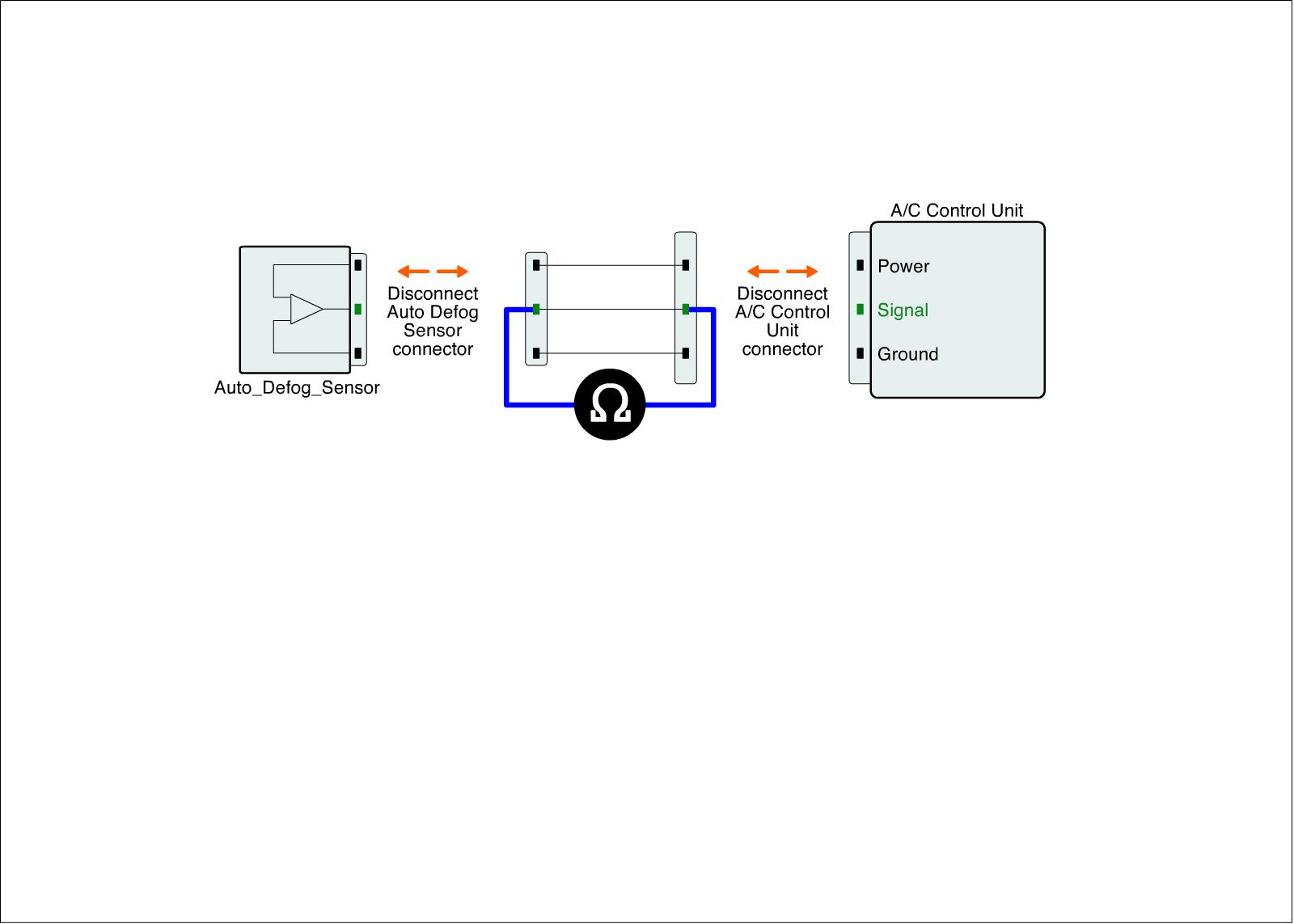 3. Measure resistance between Sensor Signal terminal of Auto Defog sensor harness connector and Sensor Signal terminal of A/C-ECU harness connector.