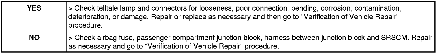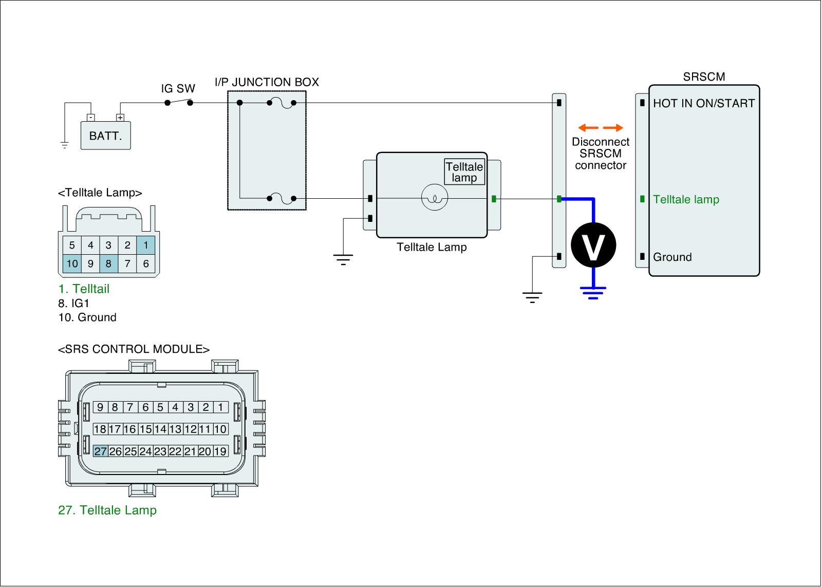 5. Measure voltage between Telltale lamp terminal of the SRSCM harness connector and chassis ground.