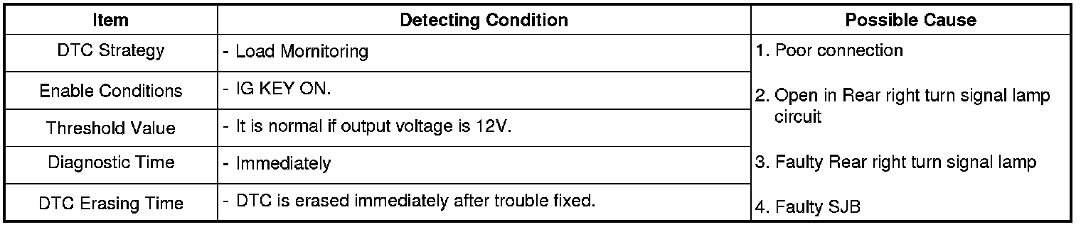 This code is set when Rear right turn signal lamp circuit is open for more than 150ms during right turn signal lamp operating.