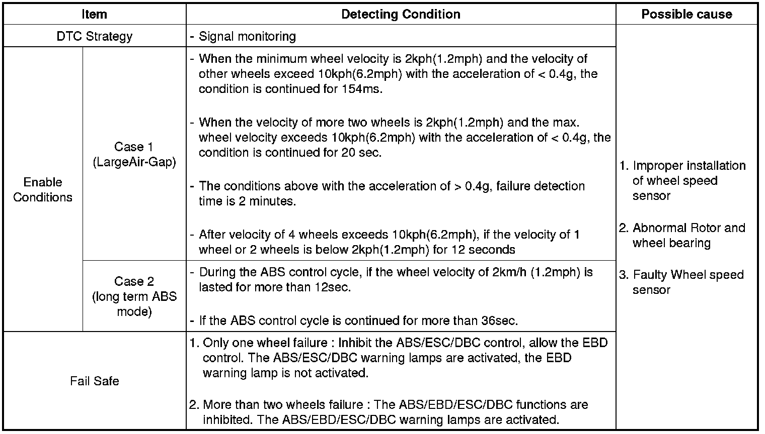 The HECU checks for air gap malfunctioning by monitoring the sensor signal at speeds between 2Km/h to 10 Km/h. Warning lamp is turned OFF unless additional faults are detected when the IG KEY is turned ON again, and wheel speed is more than 10 Km/h (6.2mph).
