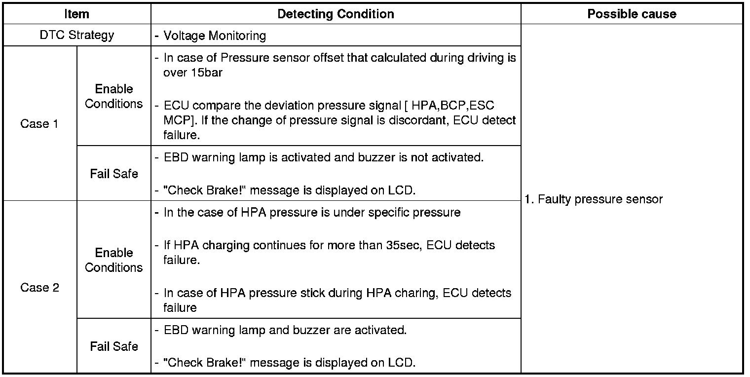 The failure is detected if the pressure sensor offset is out of normal range, or the pressure sensor signal is changed abnormally or HPA pressure is stick druing HPA charing or abnormal charging continues.