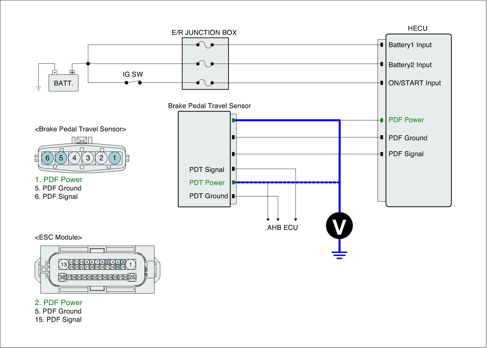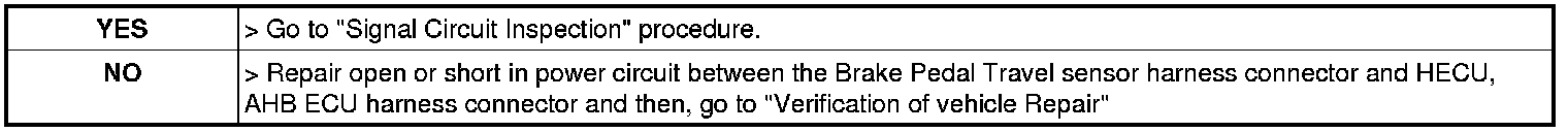 2. Measure voltage between power terminal of the Brake Pedal Travel sensor harness connector and chassis ground.