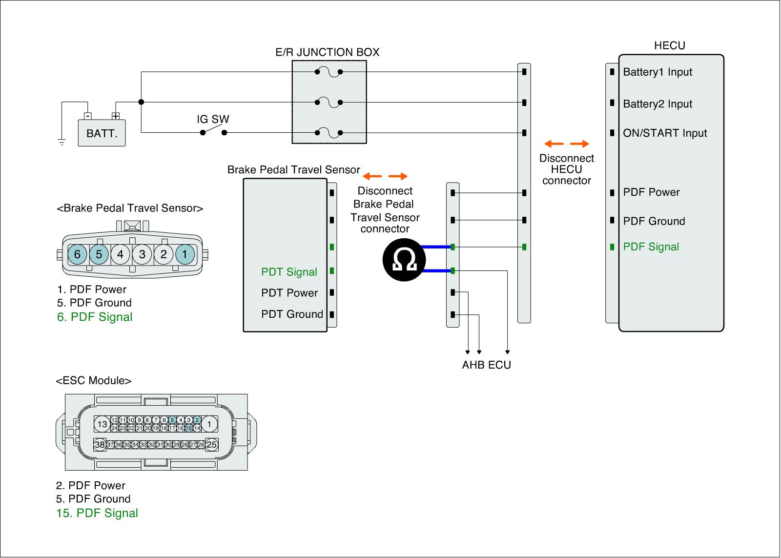 2. Disconnect the Brake Pedal Travel sensor, HECU, AHB ECU connectors.