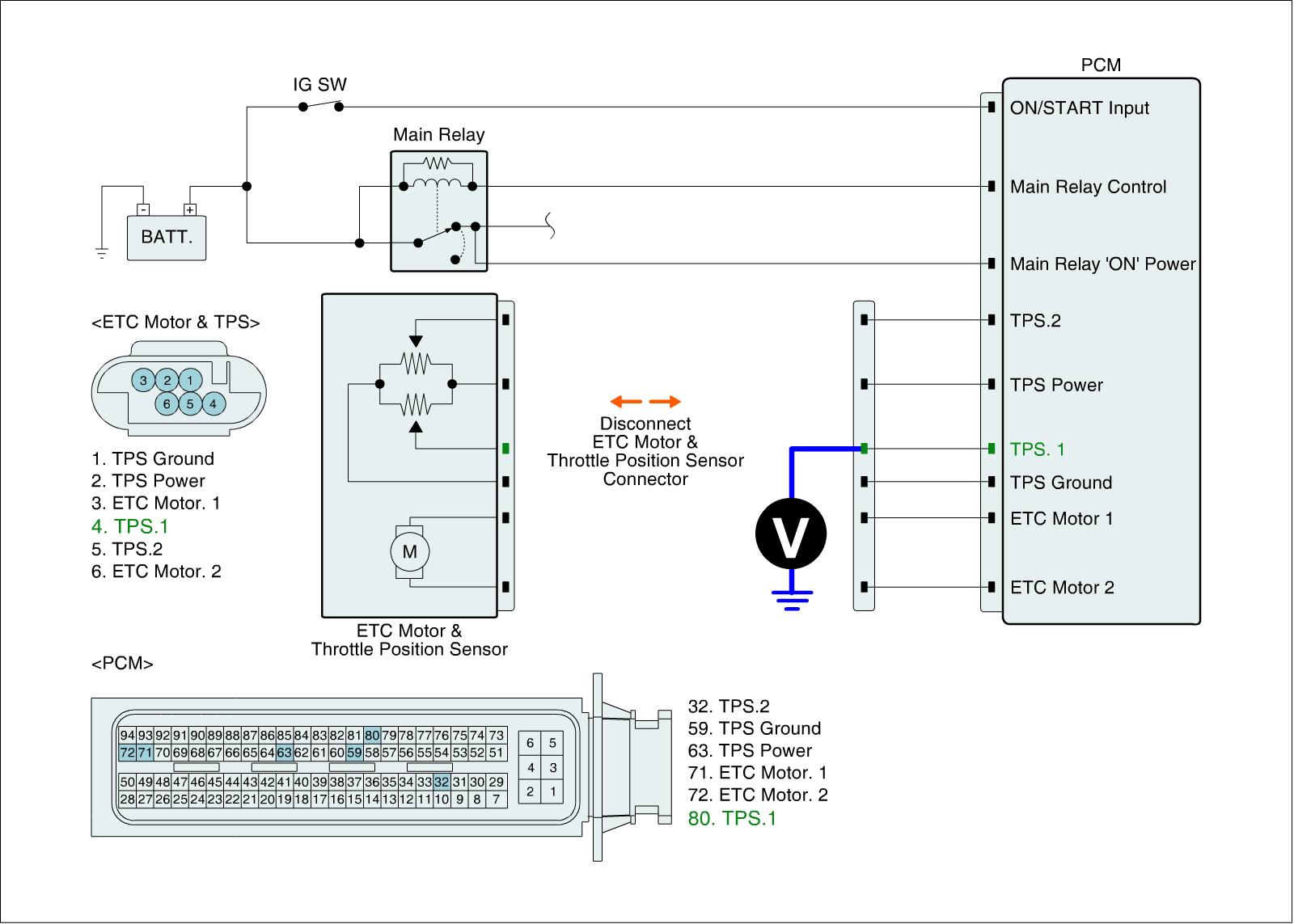 4. Measure voltage between TPS1 signal terminal of ETC harness connector and chassis ground.