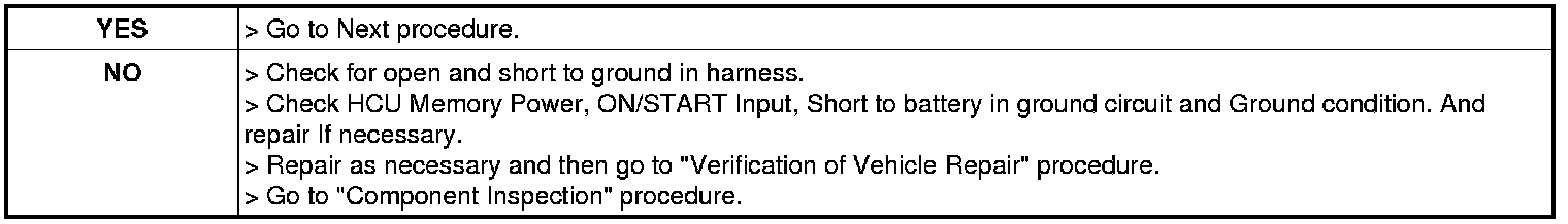 3. Measure resistance between Signal terminal of HCU harness connector and chassis ground.