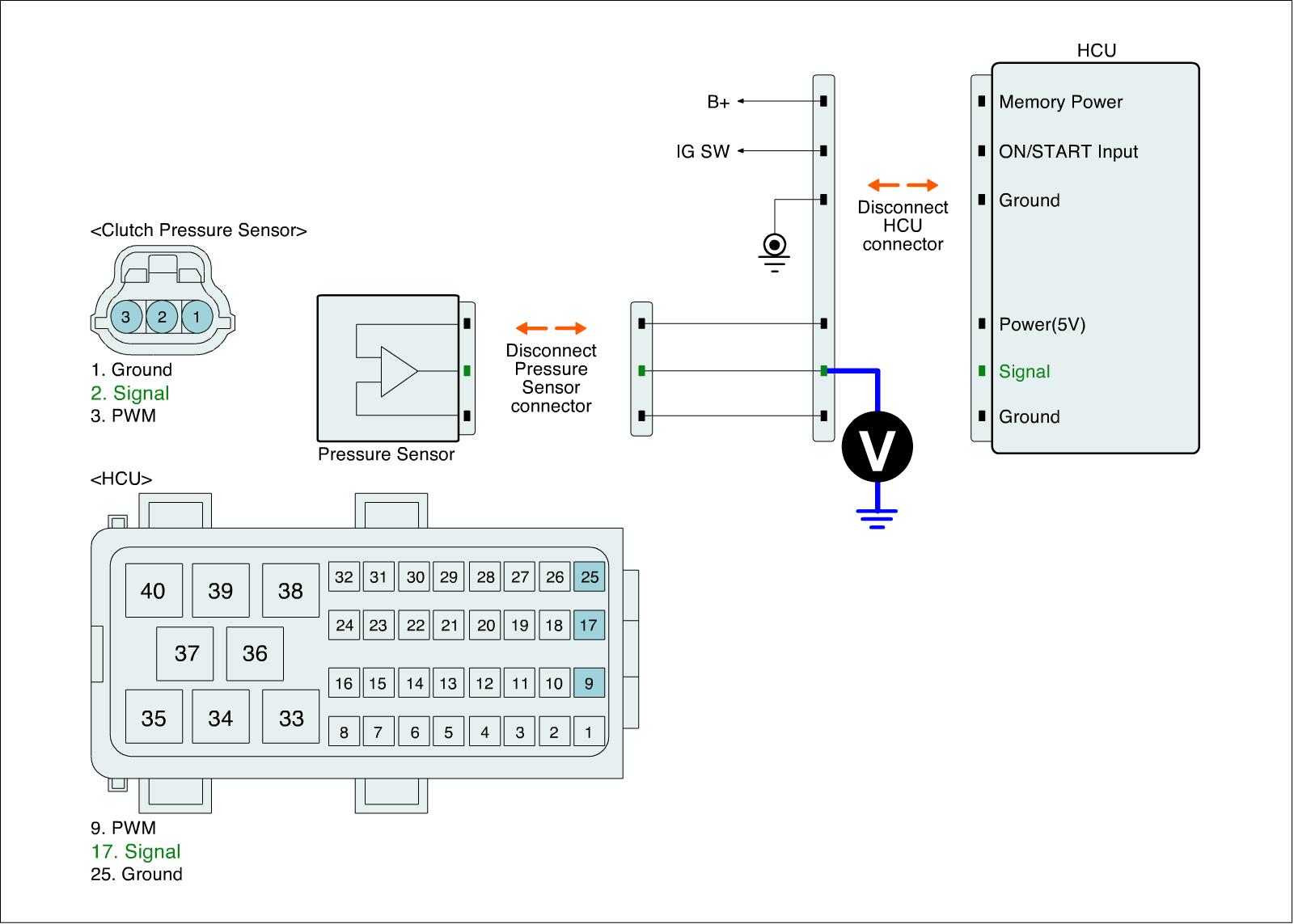 4. Measure Voltage between Signal terminal of HCU harness connector and chassis ground.