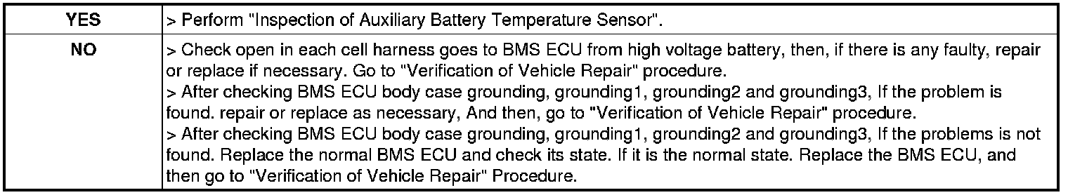 Specification :About 0.3 - 4.9V (If Auxiliary Battery Temperature Sensor temperature is 84°F, should be about 2.2V)