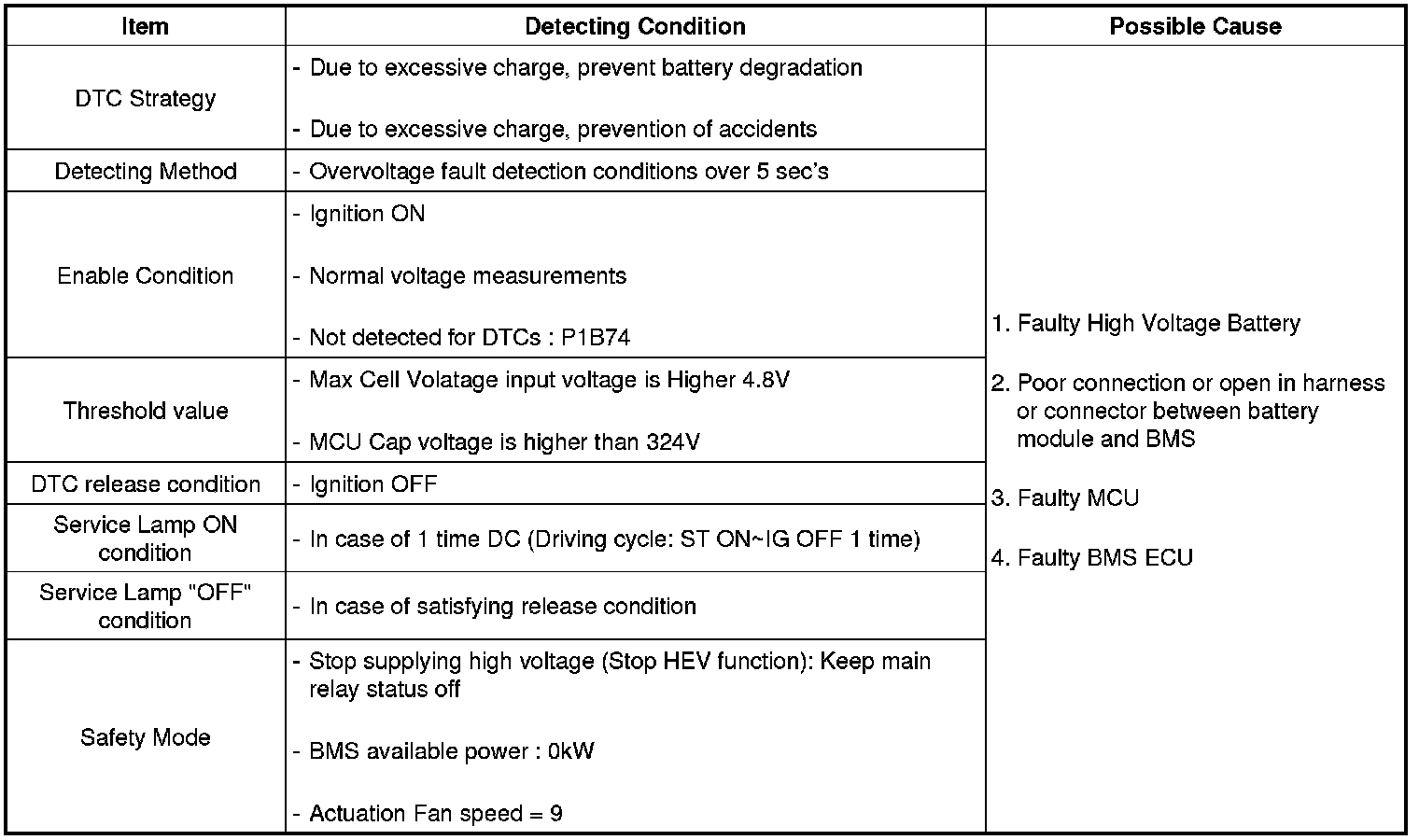 The BMS sets P1B71 when hybrid battery cell voltage is above 4.8V. If the DTC is current the Malfunction Indicator Lamp (MIL) will illuminate. If the hybrid battery cell voltage returns to normal the MIL will go out and the code will be stored in History.