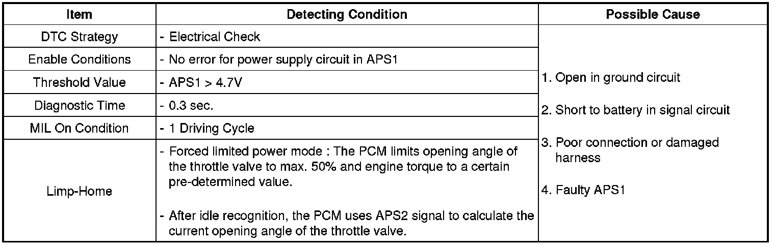PCM sets DTC P2123 if the PCM detects output voltage higher than the possible range of a properly operating APS1.