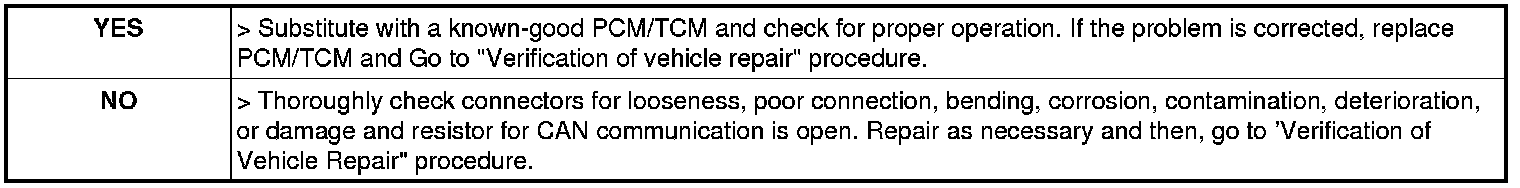 2. Measure resistance between CAN high terminal and CAN low terminal of PCM/TCM harness connector.