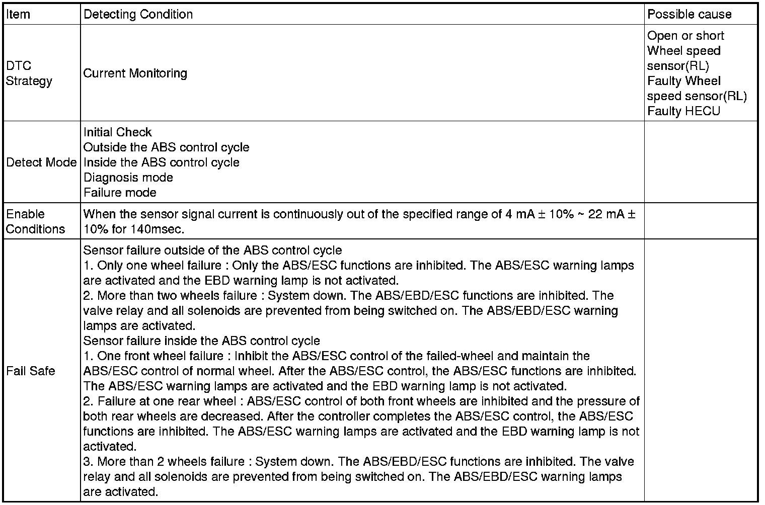 If the sensor signal current is continuously out of the specified range for 140msec, then the HECU determines that the circuit is open/short, and sets this code.