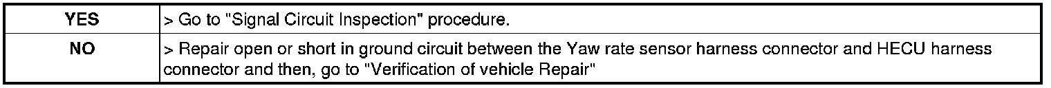3. Measure resistance between ground terminal of the Yaw rate sensor harness connector and chassis ground.
