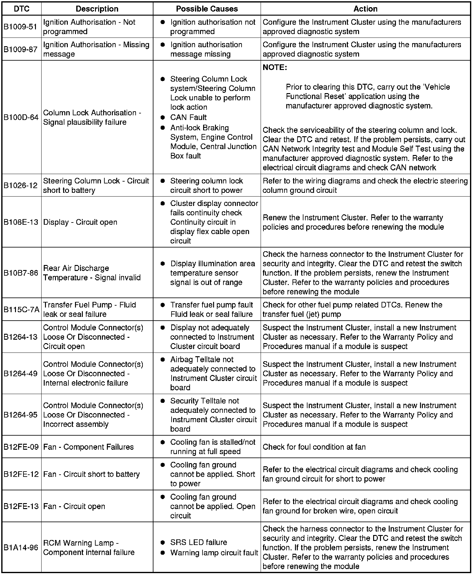 The table below lists all Diagnostic Trouble Codes (DTCs) that could be logged in the Instrument Cluster, for additional Diagnosis and Testing information refer to the relevant Diagnosis and Testing Section. For additional information, refer to Instrument Cluster