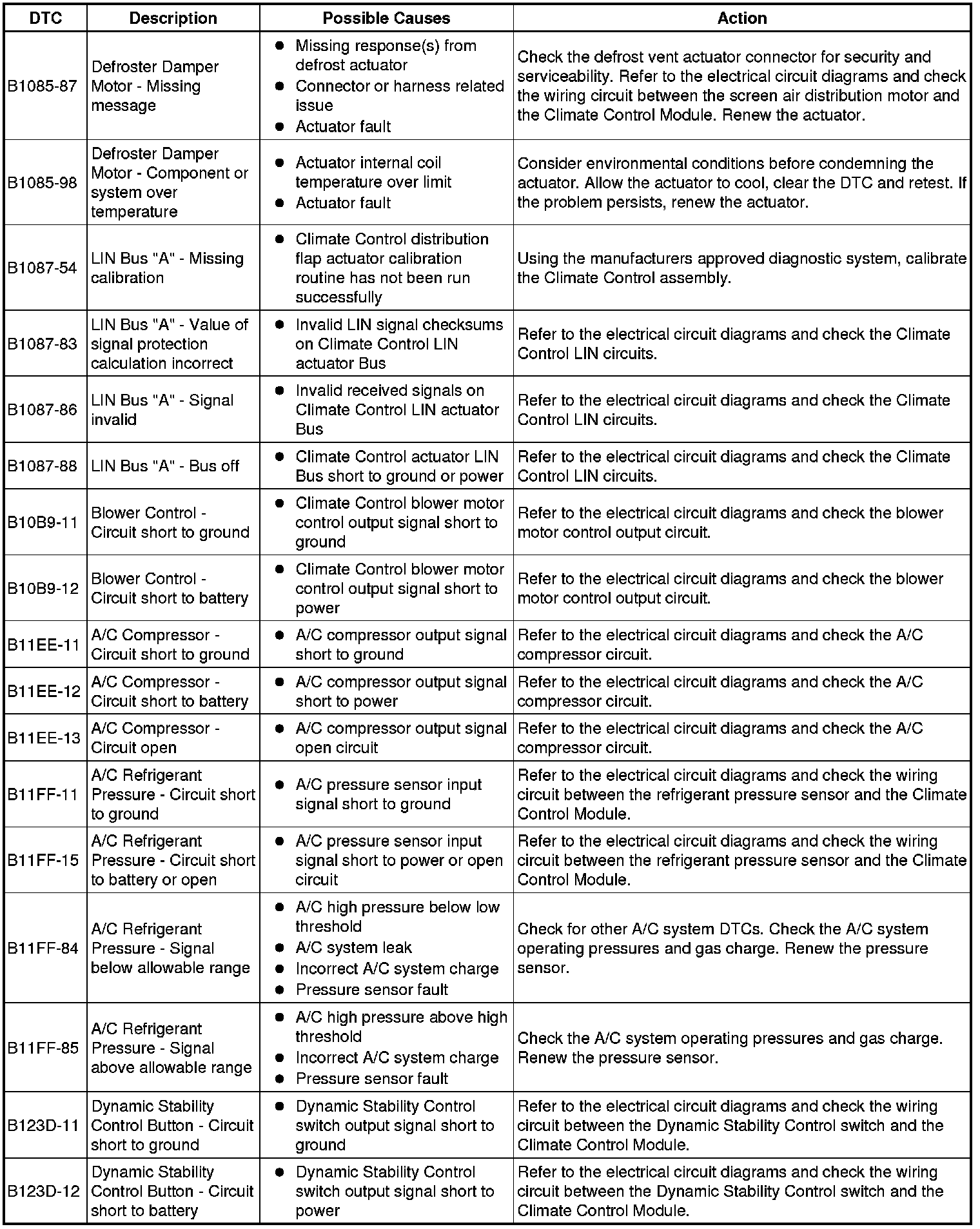 The table below lists all Diagnostic Trouble Codes (DTCs) that could be logged in the Climate Control Module, for additional Diagnosis and Testing information refer to the relevant Diagnosis and Testing Section. For additional information, refer to Climate Control System Testing and Inspection