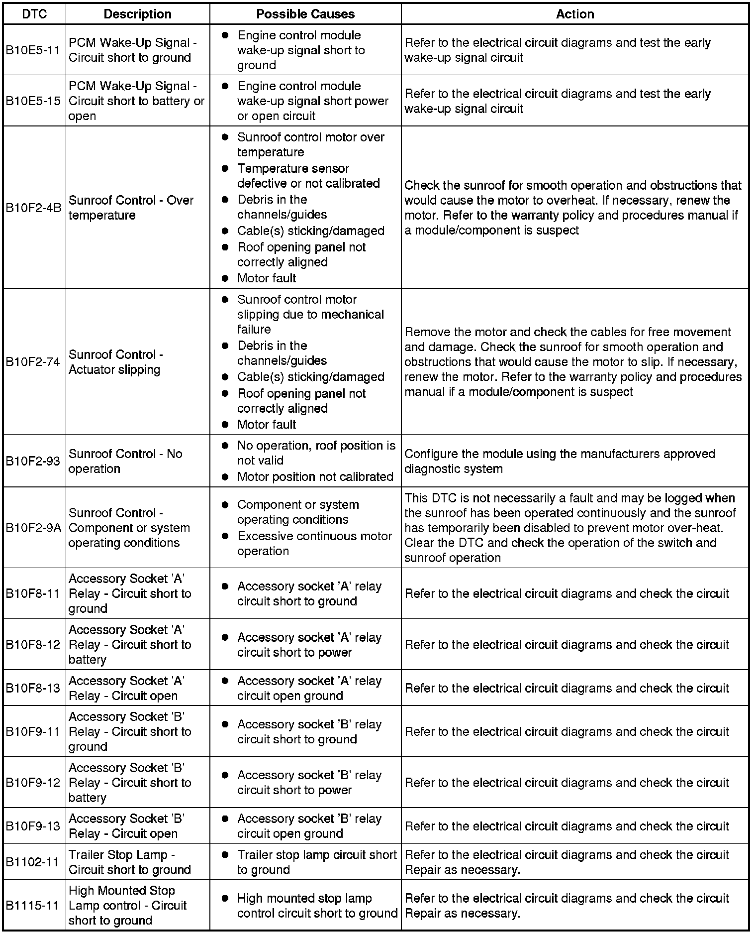 The table below lists all Diagnostic Trouble Codes (DTCs) that could be logged in the Central Junction Box, for additional Diagnosis and Testing information refer to the relevant Diagnosis and Testing Section. For additional information, refer to Communications Network Testing and Inspection