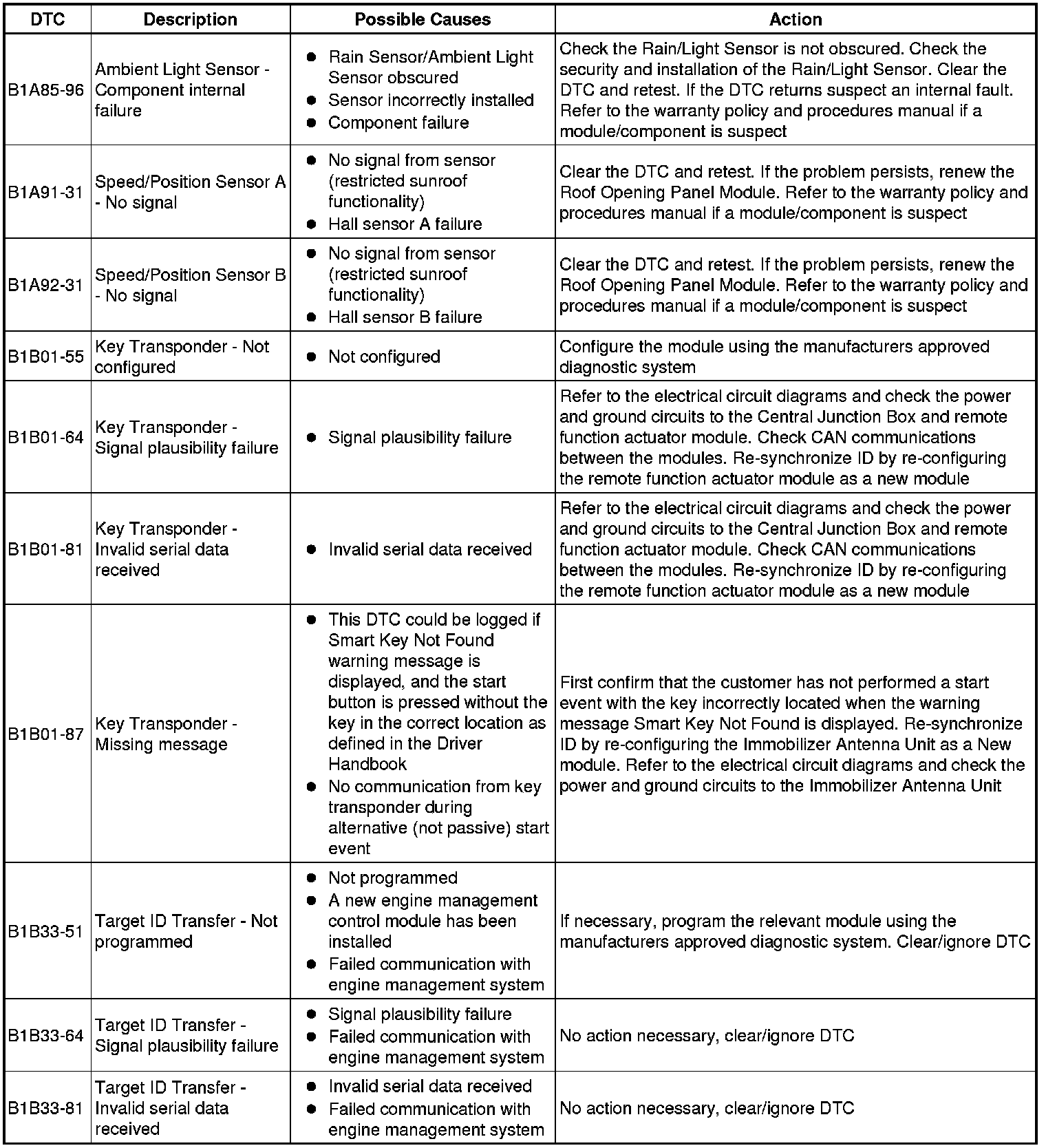 The table below lists all Diagnostic Trouble Codes (DTCs) that could be logged in the Central Junction Box, for additional Diagnosis and Testing information refer to the relevant Diagnosis and Testing Section. For additional information, refer to Communications Network Testing and Inspection
