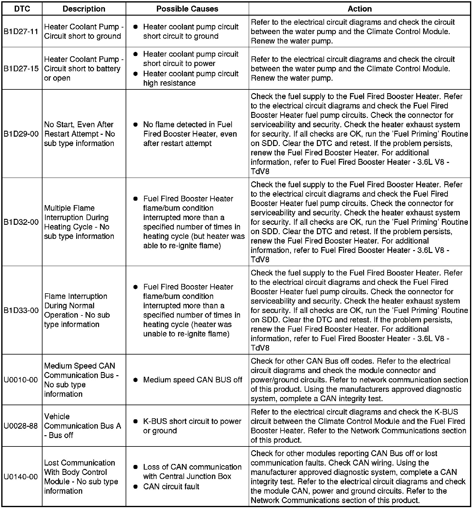 The table below lists all Diagnostic Trouble Codes (DTCs) that could be logged in the Climate Control Module, for additional Diagnosis and Testing information refer to the relevant Diagnosis and Testing Section. For additional information, refer to Climate Control System Testing and Inspection