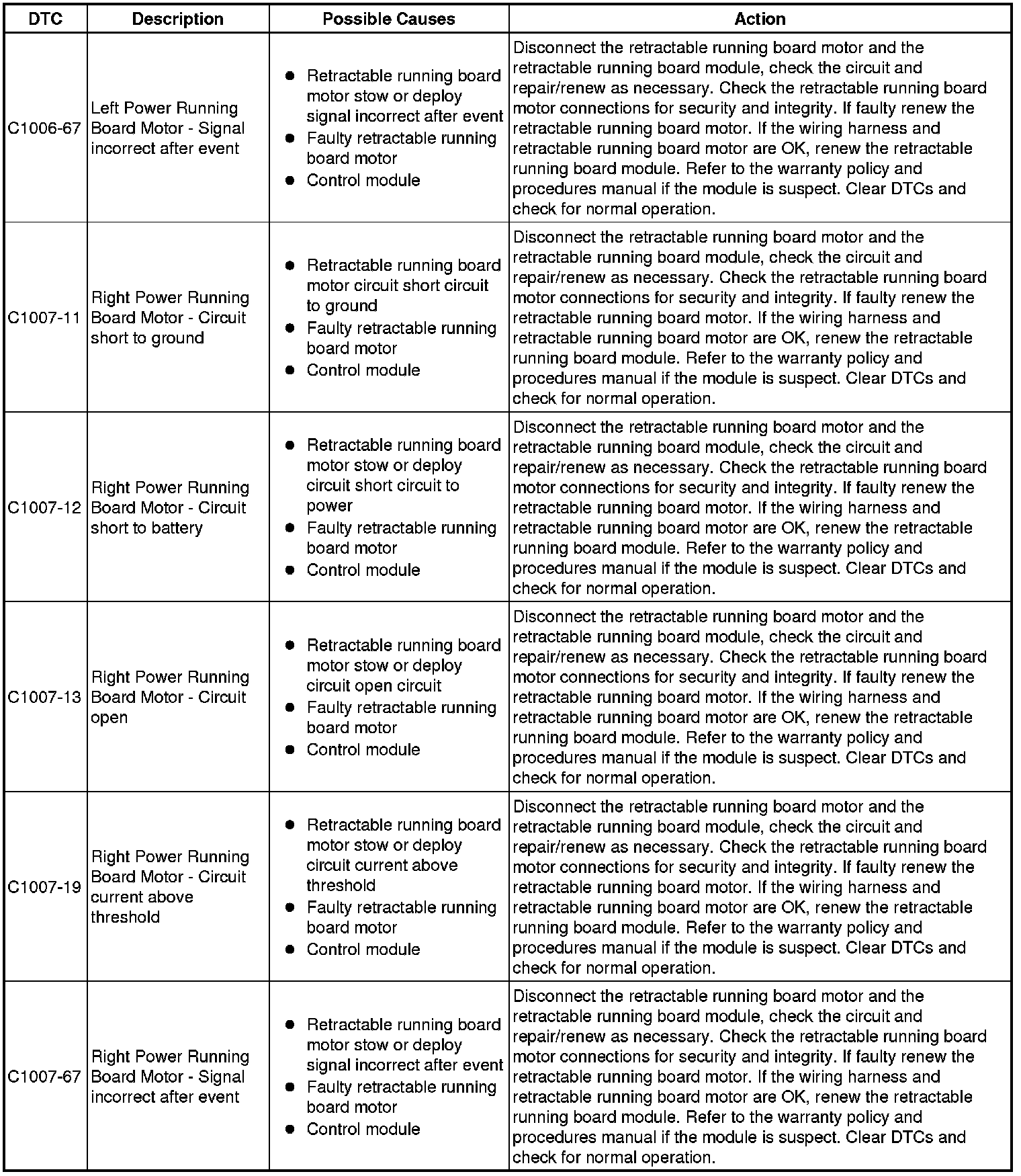 The table below lists all Diagnostic Trouble Codes (DTCs) that could be logged in the Retractable Running Board Module, for additional Diagnosis and Testing information refer to the relevant Diagnosis and Testing Section. For additional information, refer to Retractable Running Board Testing and Inspection