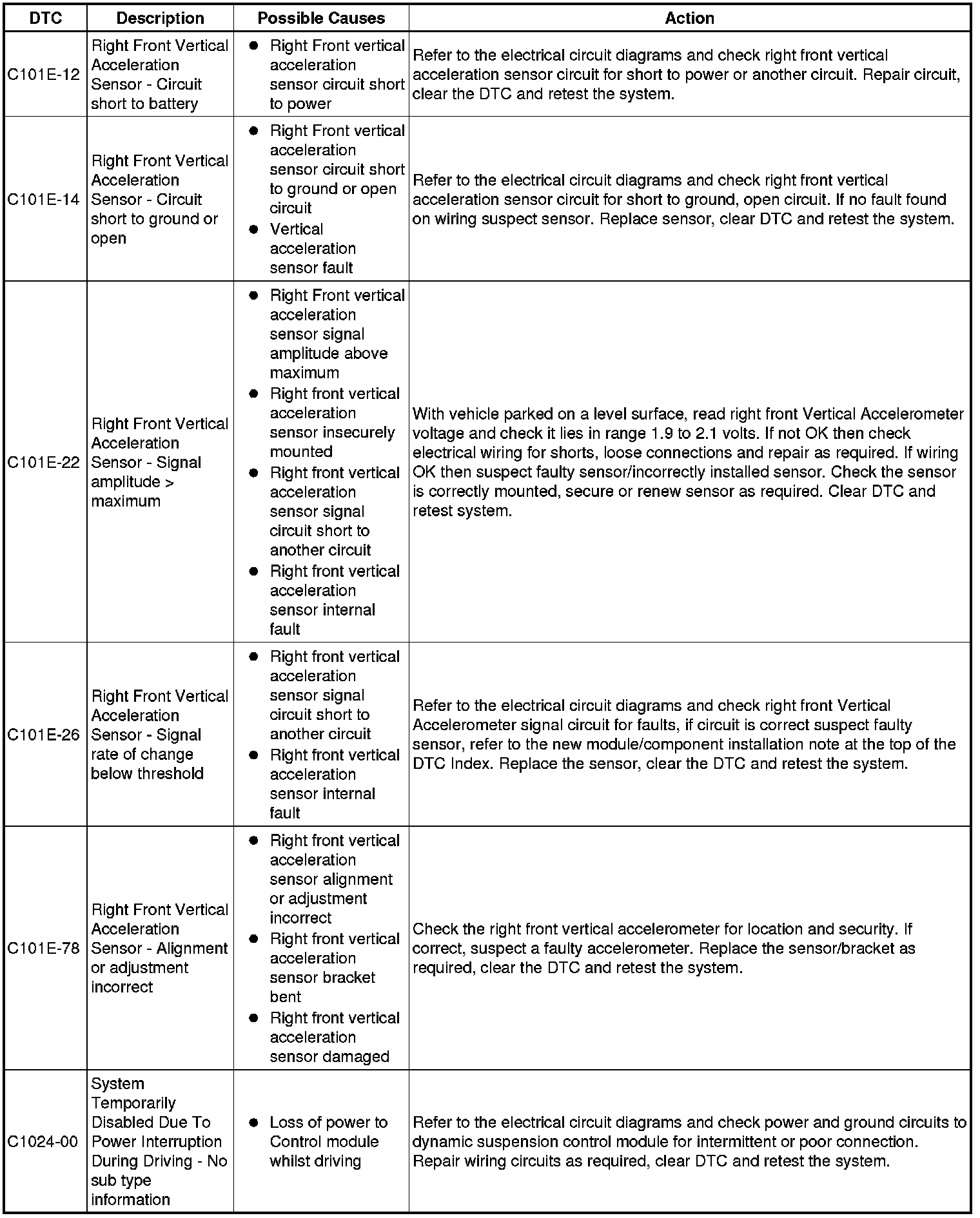 The table below lists all Diagnostic Trouble Codes (DTCs) that could be logged in the Adaptive Damping Control Module, for additional Diagnosis and Testing information refer to the relevant Diagnosis and Testing Section.