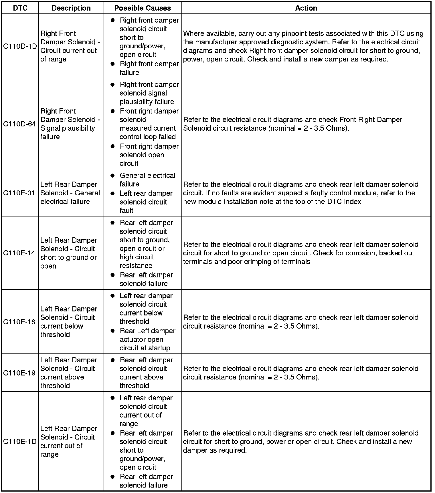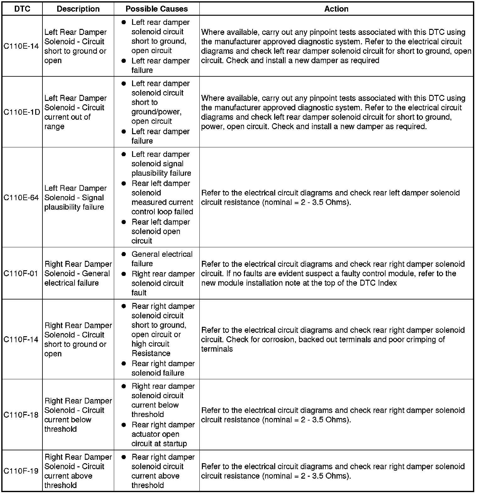 The table below lists all Diagnostic Trouble Codes (DTCs) that could be logged in the Adaptive Damping Control Module, for additional Diagnosis and Testing information refer to the relevant Diagnosis and Testing Section.