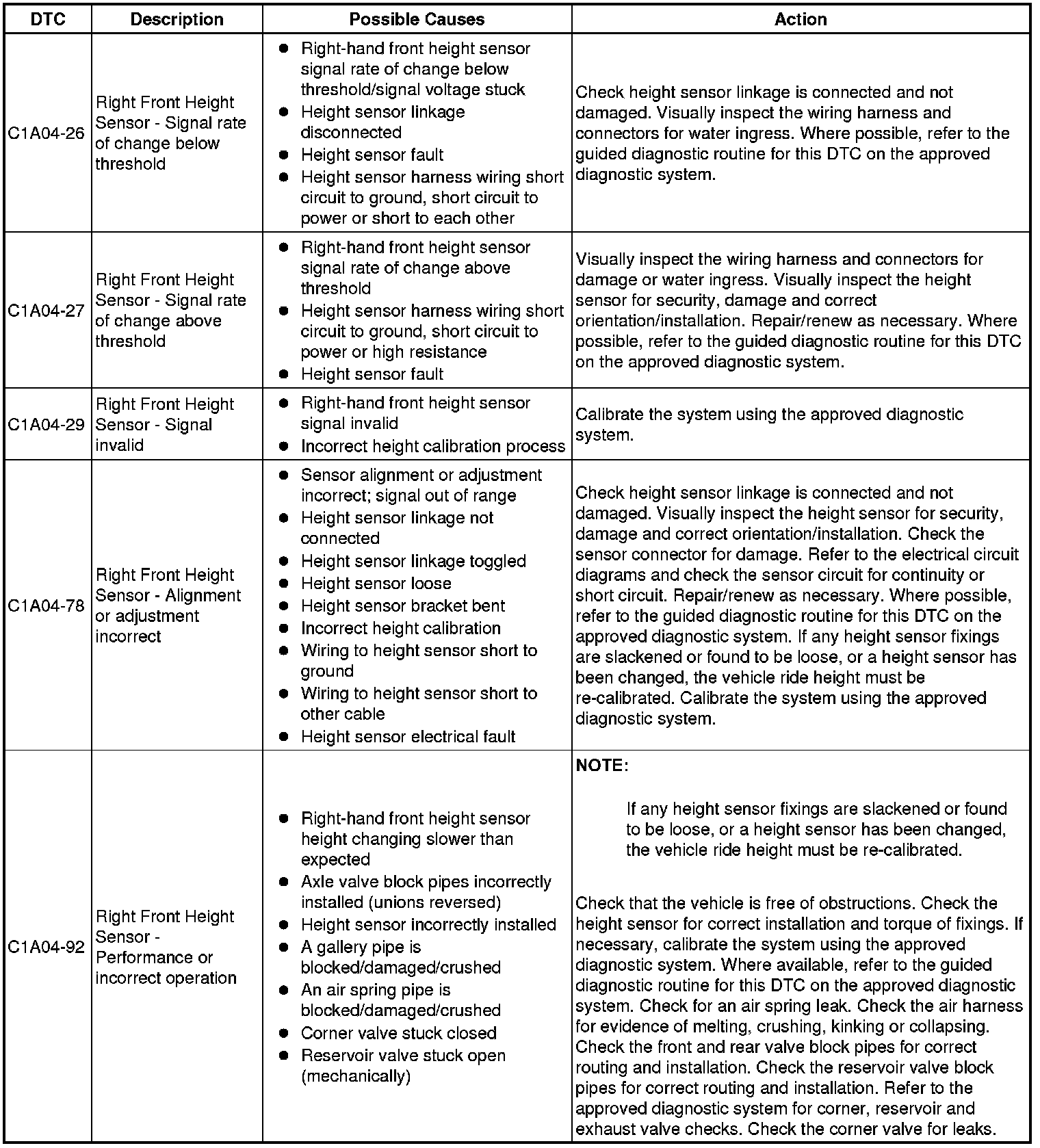 The table below lists all Diagnostic Trouble Codes (DTCs) that could be logged in the Air Suspension Control Module, for additional Diagnosis and Testing information refer to the relevant Diagnosis and Testing Section. For additional information, refer to Vehicle Dynamic Suspension Vehicle Dynamic Suspension