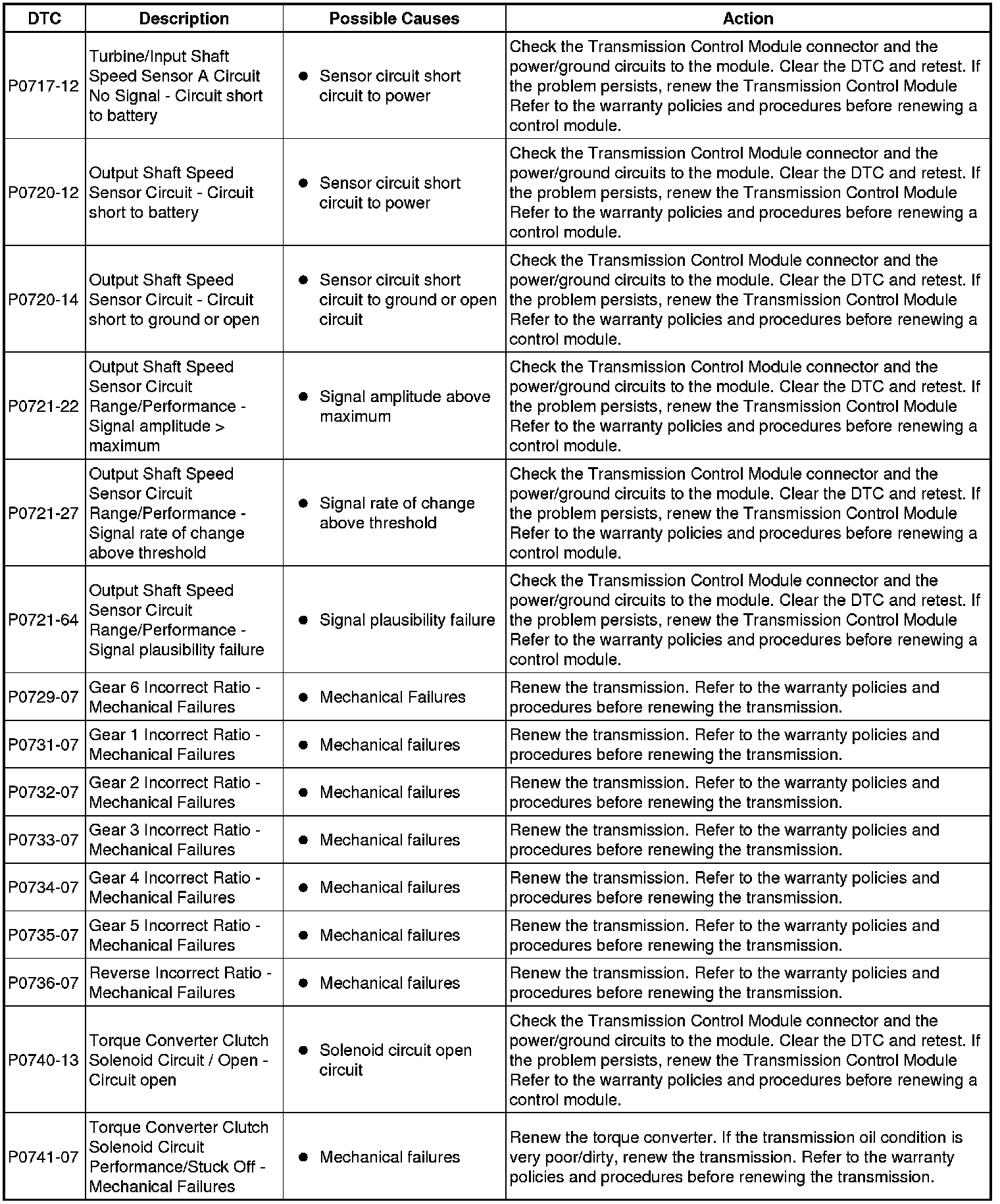 The table below lists all Diagnostic Trouble Codes (DTCs) that could be logged in the Transmission Control Module, for additional Diagnosis and Testing information refer to the relevant Diagnosis and Testing Section. For additional information, refer to Diagnostics Testing and Inspection