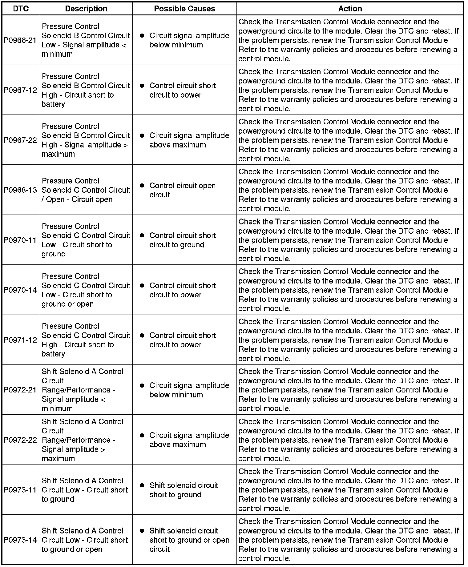 The table below lists all Diagnostic Trouble Codes (DTCs) that could be logged in the Transmission Control Module, for additional Diagnosis and Testing information refer to the relevant Diagnosis and Testing Section. For additional information, refer to Diagnostics Testing and Inspection