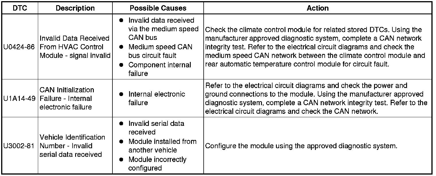 The table below lists all Diagnostic Trouble Codes (DTCs) that could be logged in the Climate Control Module, for additional Diagnosis and Testing information refer to the relevant Diagnosis and Testing Section. For additional information, refer to Climate Control System Testing and Inspection