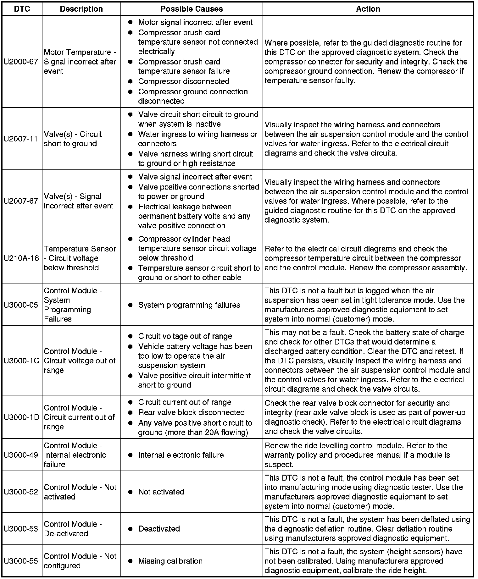 The table below lists all Diagnostic Trouble Codes (DTCs) that could be logged in the Air Suspension Control Module, for additional Diagnosis and Testing information refer to the relevant Diagnosis and Testing Section. For additional information, refer to Vehicle Dynamic Suspension Vehicle Dynamic Suspension