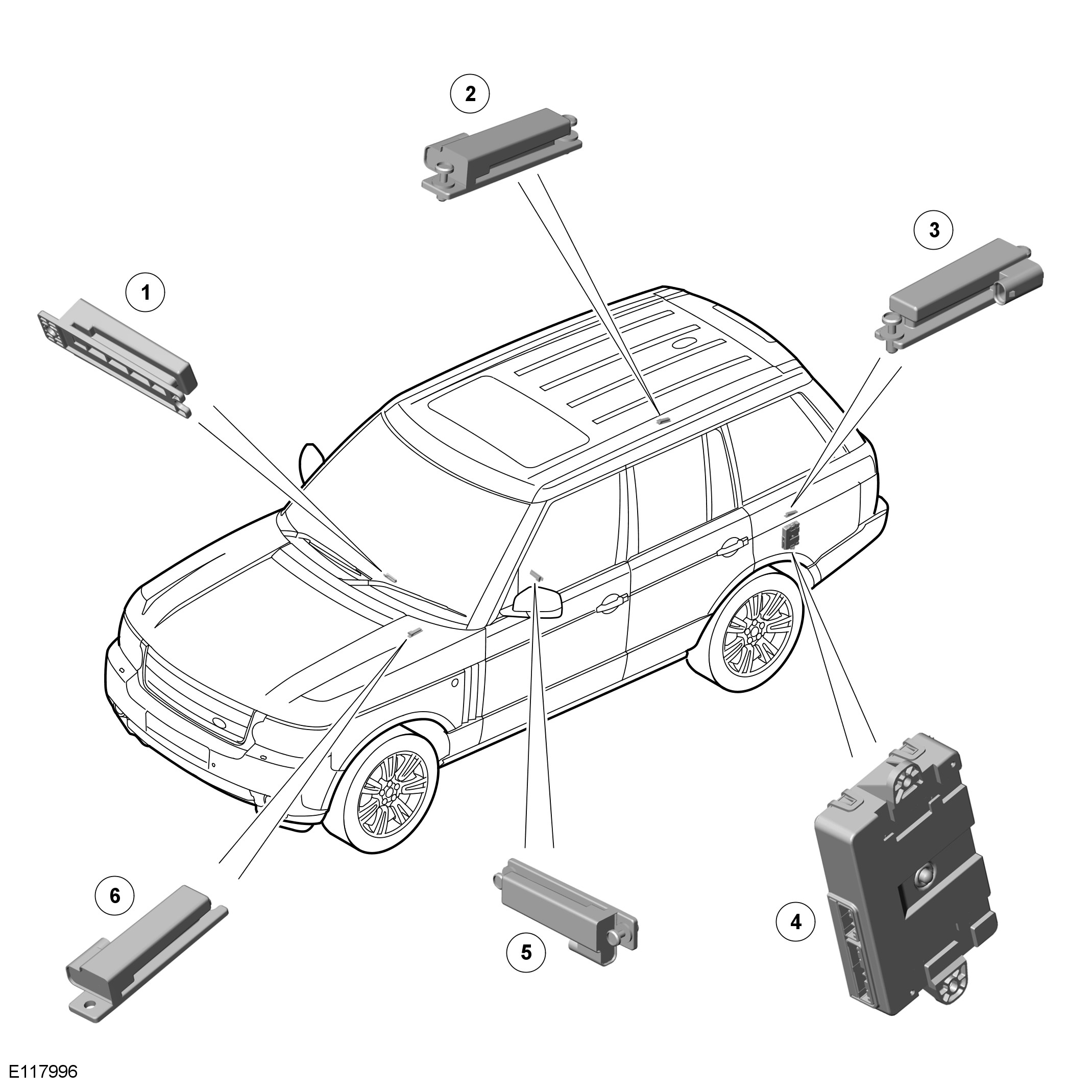 Five Low Frequency (LF) antennas for the passive start system are positioned in specific locations within the vehicle.