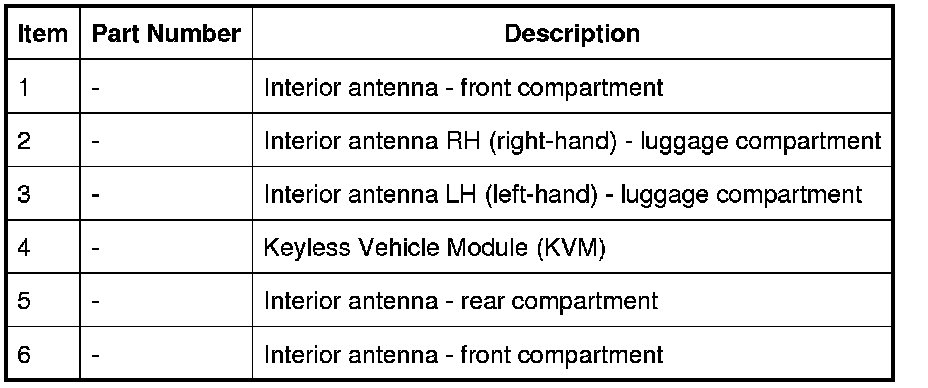 The KVM is located in the LH (left-hand) side of the luggage compartment, behind the trim panel and receives a power supply from the CJB (central junction box). A serial communication line from the KVM to the RF receiver (which is located behind the headlining, rearward of the sunroof), transmits coded data from the Smart Key to the KVM for vehicle locking and unlocking using the Smart Key buttons.