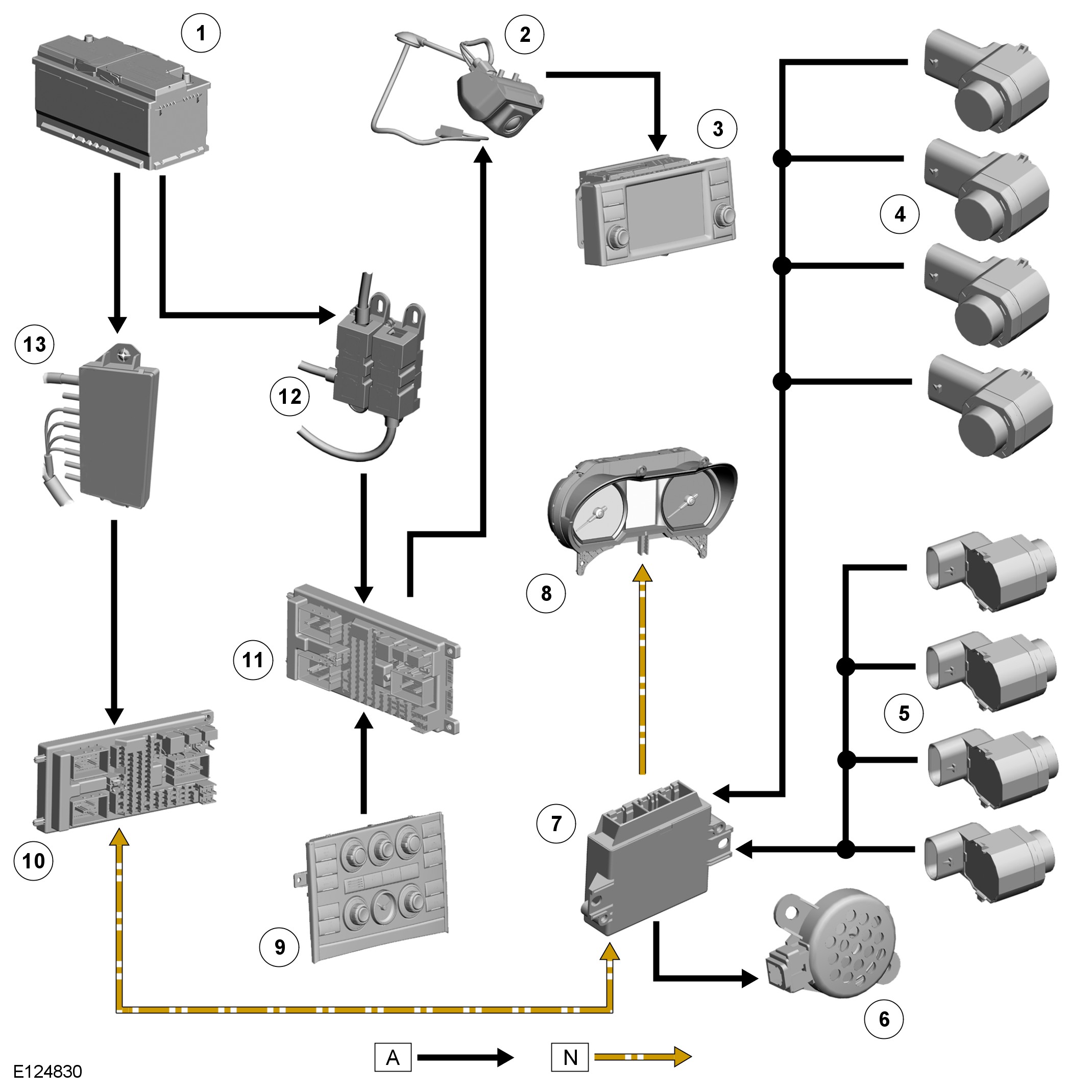 Three connectors provide the interface between the parking aid module and the vehicle wiring. The parking aid module is powered by the AJB (auxiliary junction box). In addition to hardwired connections with the parking aid sensors, parking aid sounder and power supply, the parking aid module communicates with the instrument cluster on the medium speed CAN (controller area network).
