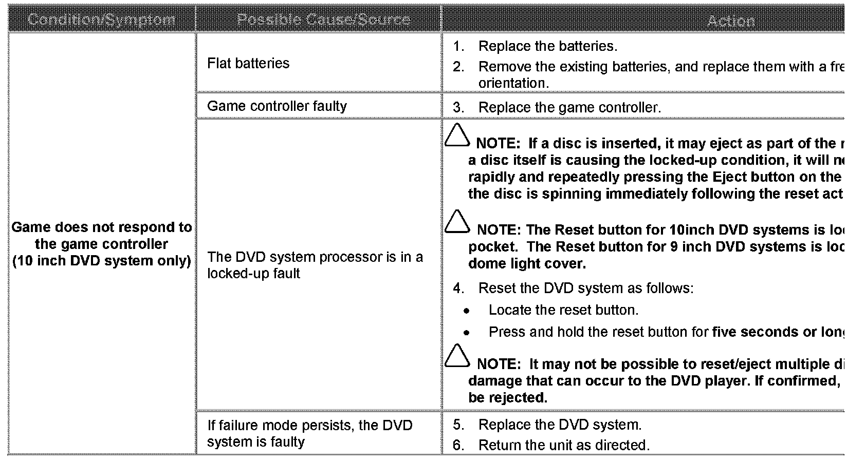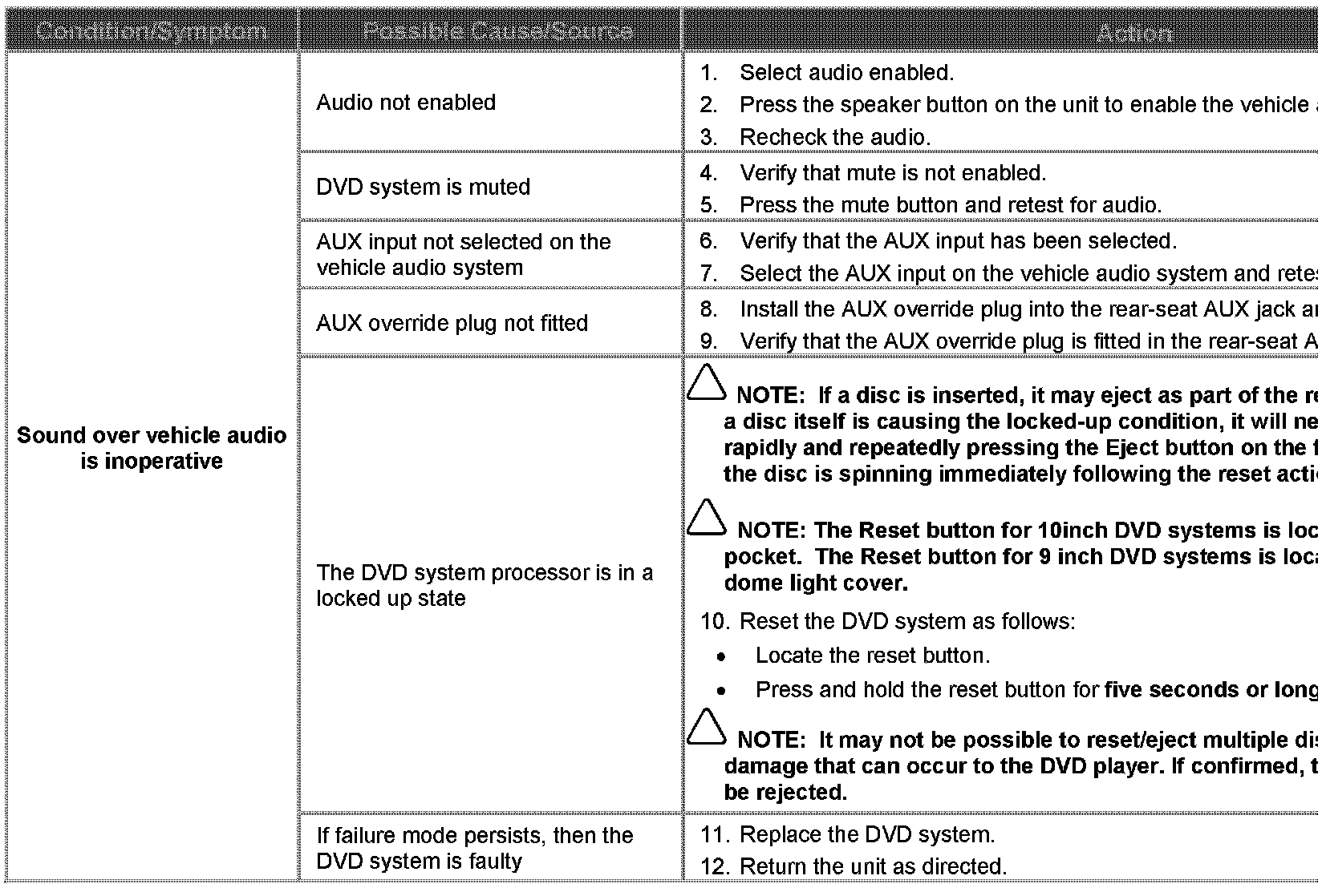 A range of software and hardware issues within the DVD system contribute to difficulty in diagnosis of system faults. The concerns are: failing in use, locking up, refusal to load discs, ejecting/sticking discs, distorted picture. This Technical Bulletin has been issued to supply a Diagnostic Procedure for accessory-installed DVD systems.