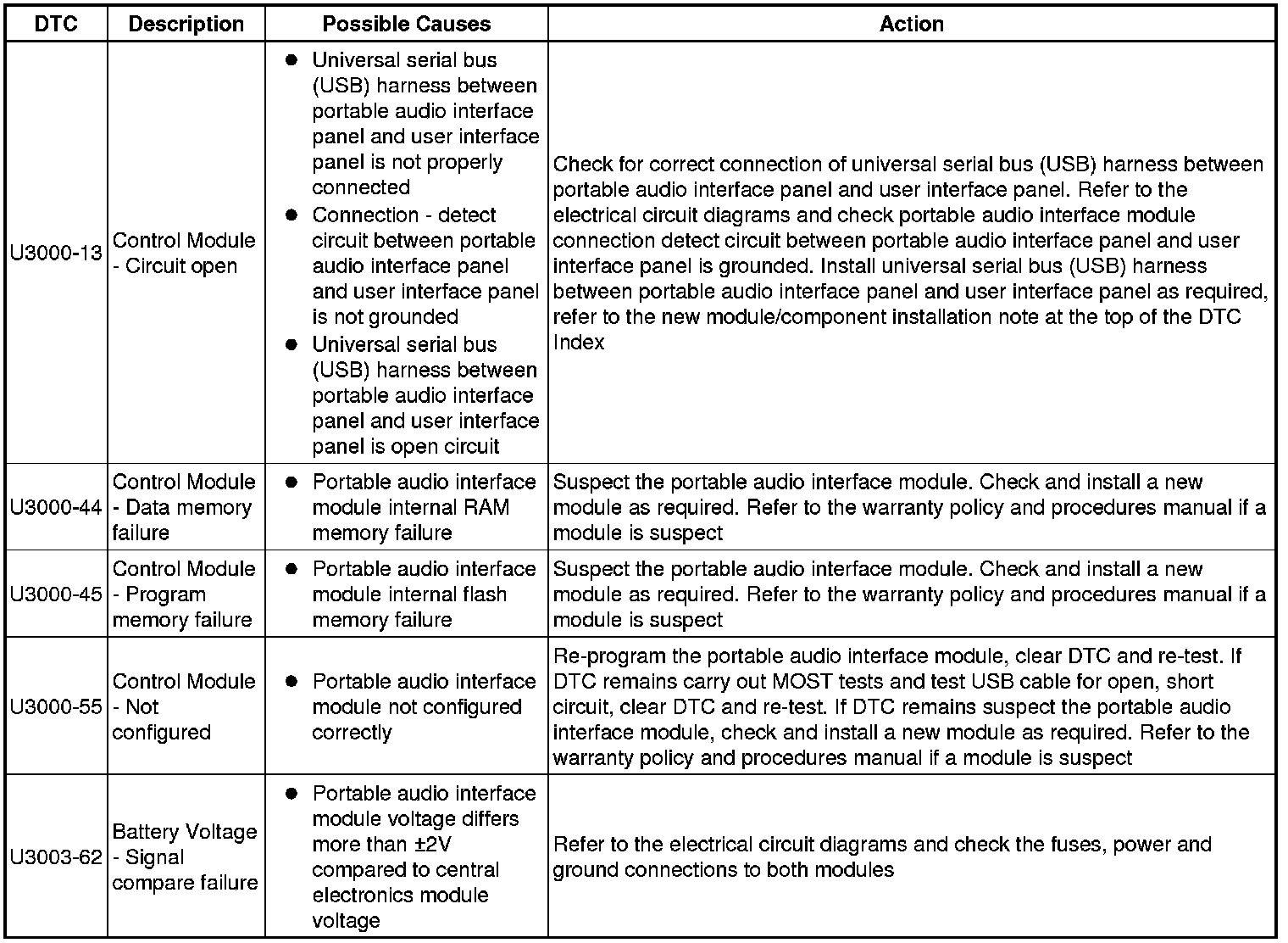 The table below lists all Diagnostic Trouble Codes (DTCs) that could be logged in the Portable Audio Interface Module, for additional Diagnosis and Testing information refer to the relevant Diagnosis and Testing Section. For additional information, refer to Information and Entertainment System Initial Inspection and Diagnostic Overview