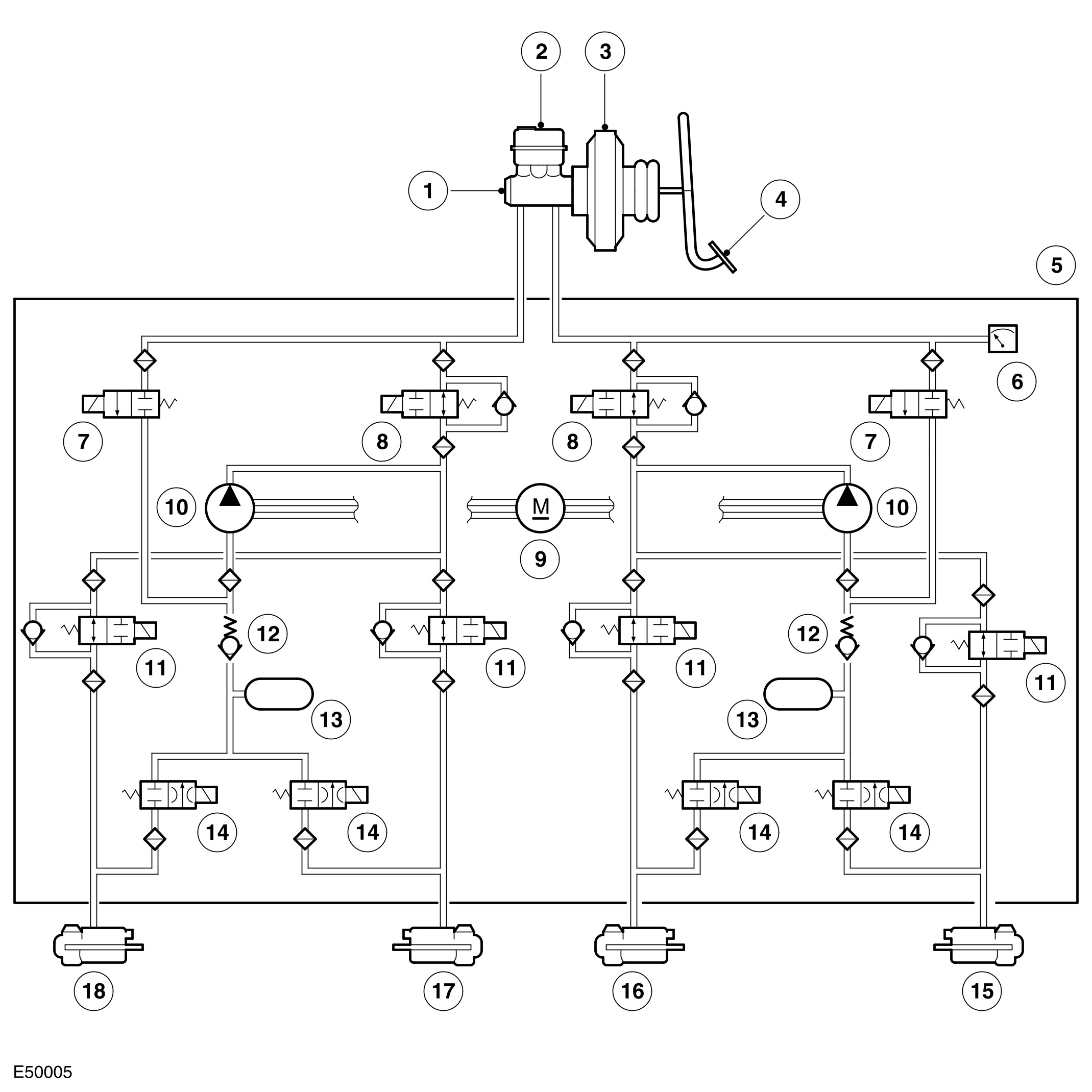 Initially, all of the solenoid operated valves are de-energized. Operating the brake pedal produces a corresponding increase or decrease of pressure in the brakes, through the open pilot valves and inlet valves. If the ABS (anti-lock brake system) module determines that EBD is necessary, it energizes the inlet valves for the brakes of the trailing axle, to isolate the brakes from any further increase in hydraulic pressure.