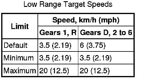 The target speed varies between minimum and maximum values for each gear and transmission range, depending on driver input with the accelerator pedal. If the accelerator pedal is not operated, the ABS (anti-lock brake system) module adopts a default target speed.