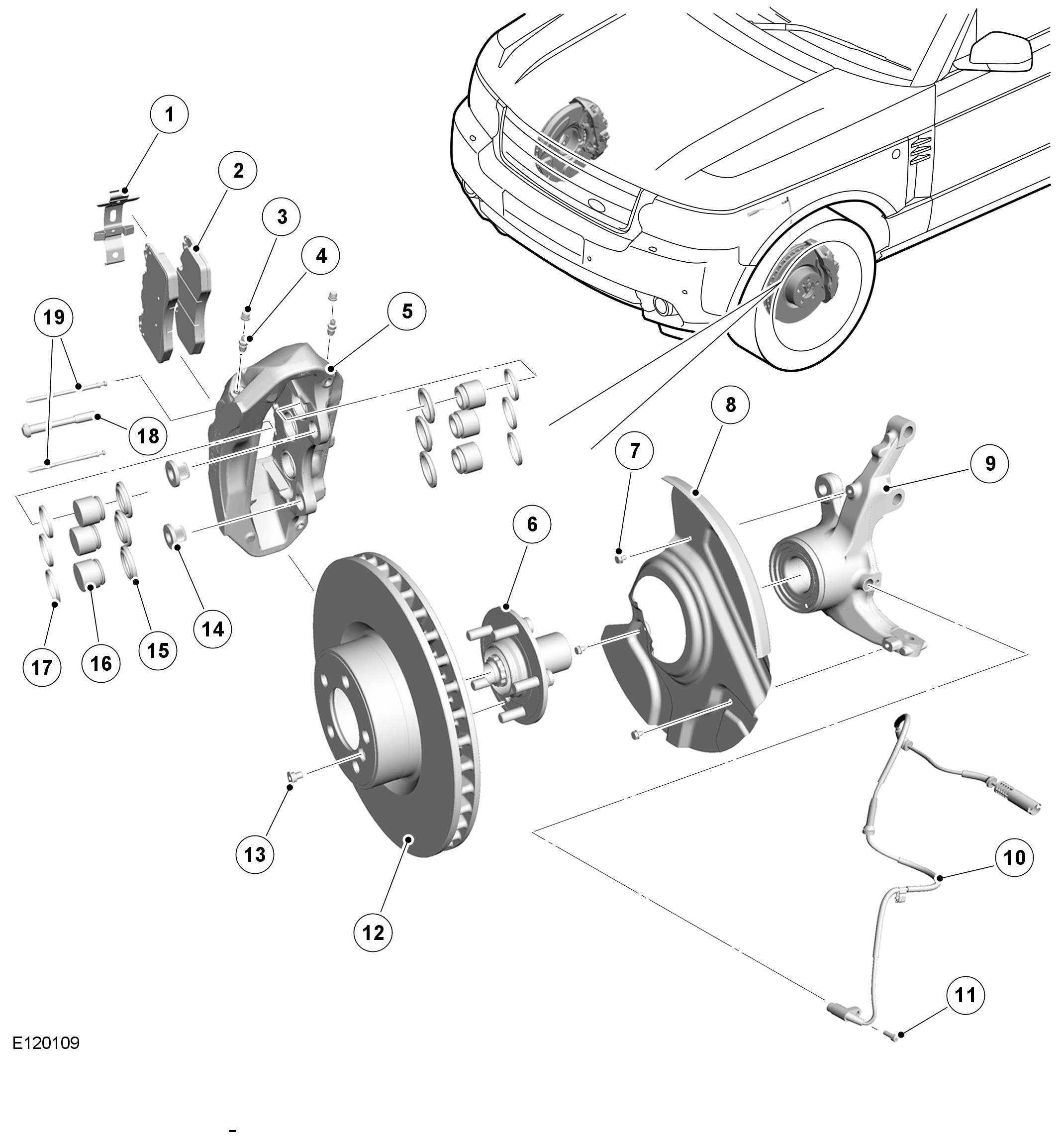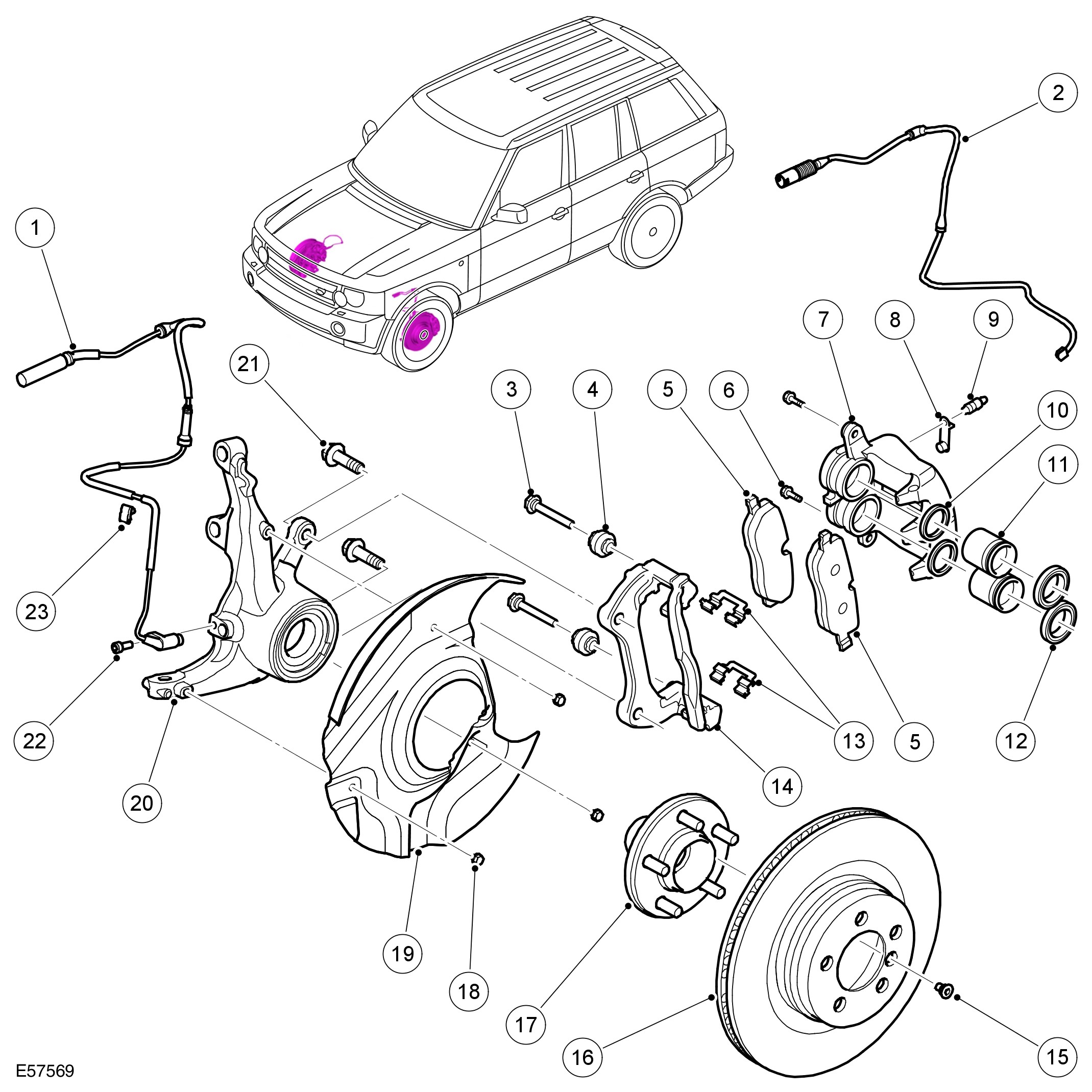 On all models the brake caliper is attached to the rear of the front knuckle. The brake pads are made from an asbestos free material. The inboard brake pad of the left front brake incorporates a wear sensor.