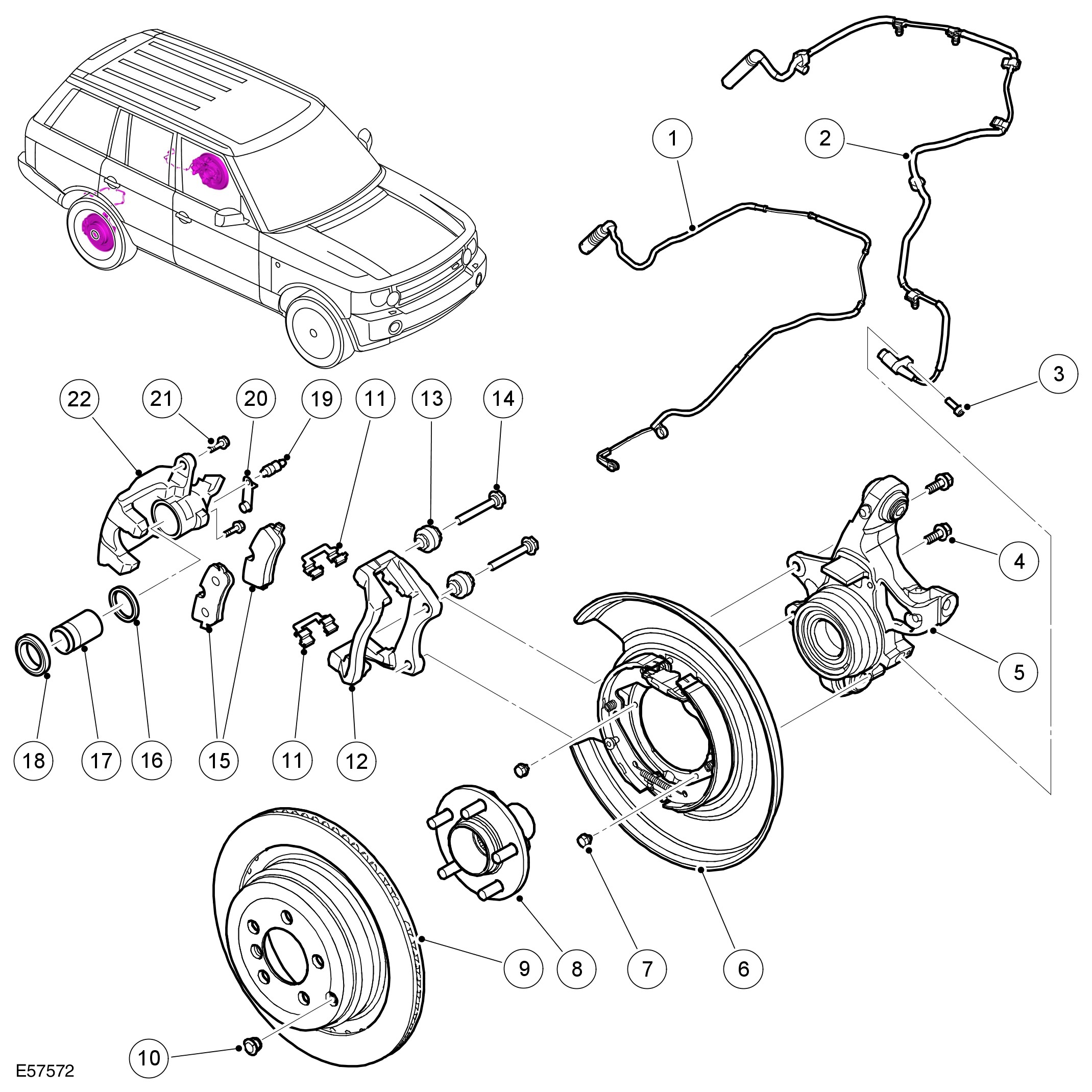 The brake caliper is attached to the rear of the rear knuckle. The brake pads are made from an asbestos free material. The inboard brake pad of the right rear brake incorporates a wear sensor.